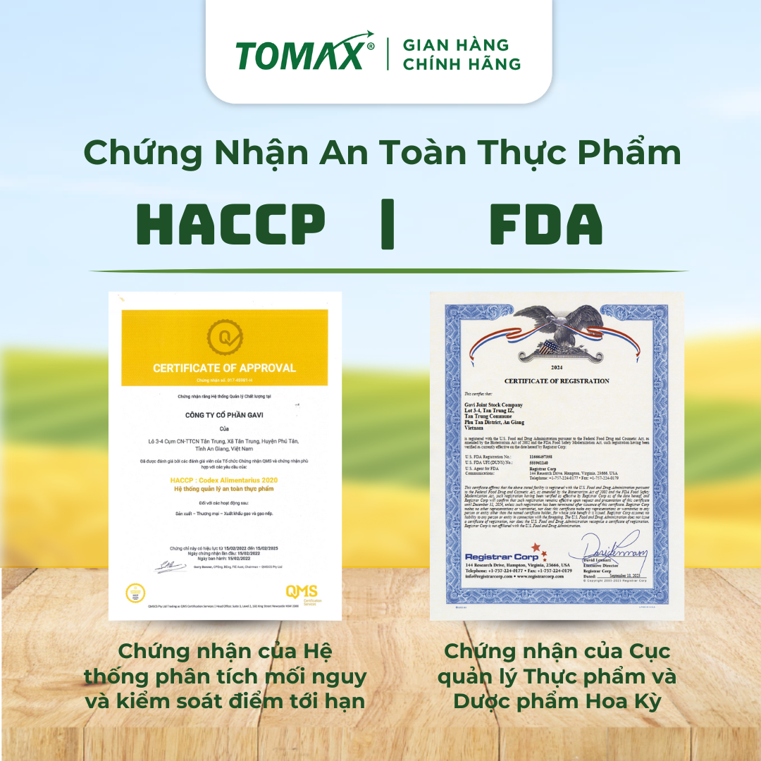 Mua tại TiktokVới tâm huyết của một “lão nông tri điền”, ông Trần Văn Mây - Người sáng lập Gavi, đối tác sản xuất của Tomax Holding đã nghiên cứu và ứng dụng phân bón hữu cơ vi sinh, kiến tạo mô hình nông nghiệp xanh tiêu biểu. Đồng thời tạo ra những sản phẩm an toàn, chất lượng cho người tiêu dùng, đưa giá trị gạo Việt vươn tầm thế giới. Được sản xuất từ 100% chế phẩm sinh học và các loại cây thảo dược có tính chất giải độc, phân bón hữu cơ vi sinh của Tomax Holding đã nhanh chóng cải thiện chất lượng đất, nâng cao năng suất và chất lượng của cây lúa ngay vụ mùa đầu tiên. Đồng thời, Tomax còn sử dụng giống lúa thuần chủng, quản lý côn trùng và bệnh hại theo phương pháp sinh học, ứng dụng công nghệ thu hoạch, chế biến và đóng gói theo tiêu chuẩn quốc tế để tạo ra những cánh đồng vàng bất tận với chất lượng cao cấp nhất. Việc canh tác theo quy trình khép kín đã giúp Tomax Holding thành công mang đến khách hàng những sản phẩm gạo sạch thượng hạng, trong đó có gạo đặc sản Sóc Trăng ST25 Deli Rice 100% hữu cơ - Loại gạo giành giải nhất trong cuộc thi "Gạo ngon nhất thế giới" năm 2019 – World’s Best Rice. Giá trị ưu việt của Gạo sạch đặc sản Sóc Trăng ST25 Deli Rice Được canh tác theo hướng hữu cơ với quy trình khép kín đạt chuẩn, gạo sạch ST25 của Tomax Holding sở hữu những ưu điểm vượt trội: Được chọn lựa kỹ lưỡng, từng hạt gạo ST25 trắng ngần, dài, và có hương thơm tự nhiên đặc trưng, mang đến bữa cơm mềm dẻo, ngọt dịu, giữ trọn vẹn giá trị dinh dưỡng và hương vị tinh tế. Hoàn toàn tự nhiên - Không thuốc bảo vệ thực vật; Không hương liệu nhân tạo; Không chứa chất tạo màu, chất bảo quản; Không chất tẩy trắng, Không GMO đảm bảo an toàn và nâng cao sức khỏe cho người tiêu dùng. Canh tác hữu cơ với tiêu chuẩn an toàn vệ sinh thực phẩm quốc tế HACCP, FDA Chuỗi sản xuất khép kín và đồng nhất (Field - Factory - Food): Dễ dàng truy xuất nguồn gốc và kiểm soát chất lượng gạo. Luôn đảm bảo sản phẩm mới, sạch và trọn vẹn dưỡng chất từ hạt gạo. Khả năng chủ động và tự cung ứng trong quá trình gieo trồng, sản xuất nên giá thành sản phẩm cạnh tranh hơn, giao hàng nhanh và chính sách hậu mãi tốt. Thông tin chi tiết sản phẩm gạo đặc sản Sóc Trăng ST25 Deli Rice Giá trị dinh dưỡng (trong 100g gạo):