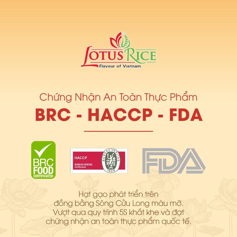 Gạo sạch phải có chứng nhận an toàn thực phẩm in trên bao bì. Gạo Nhật Sushi Lotus Rice trồng theo quy trình 5S, đạt chứng nhận HACCP - ISO 22000 - BRC. Đặc biệt, gạo Nhật Sushi Lotus Rice được Cục quản lý thực phẩm dược phẩm Hoa Kỳ cấp chứng nhận FDA. Đạt được chứng nhận FDA Hoa Kỳ là điều rất khó. Chính vì vậy, bất kì một sản phẩm, thiết bị nào đã qua kiểm duyệt và đạt chứng nhận của FDA Hoa Kỳ đều mang tính an toàn tuyệt đối cho sức khỏe của con ngườ