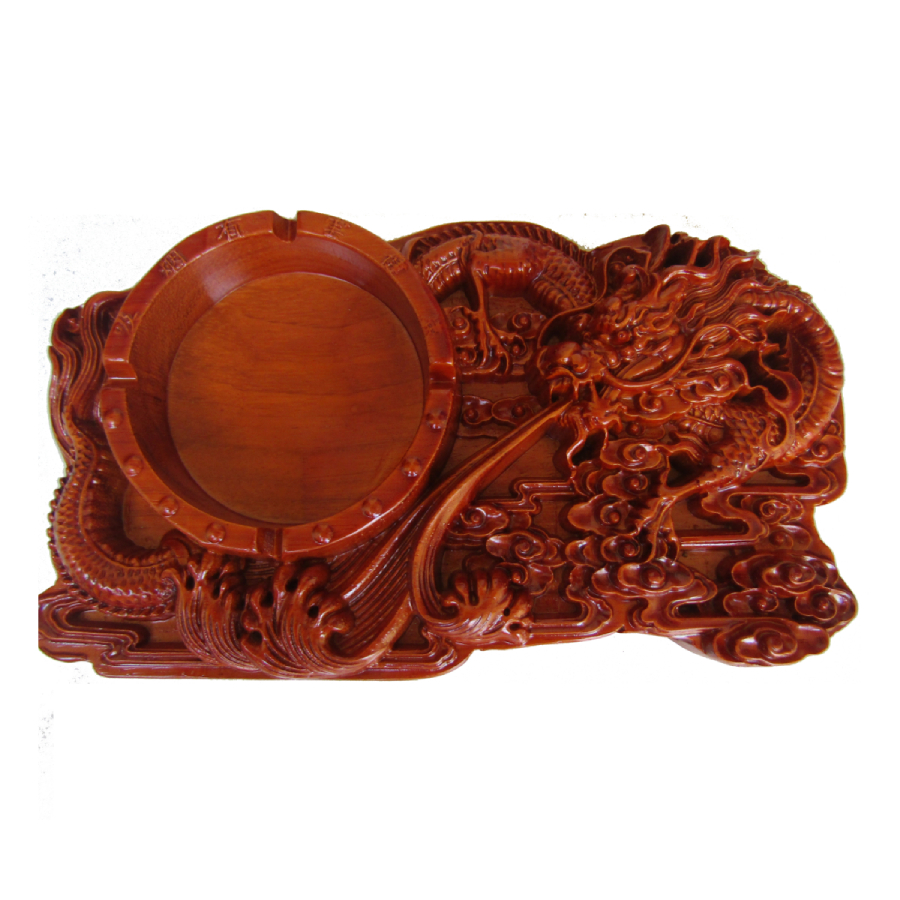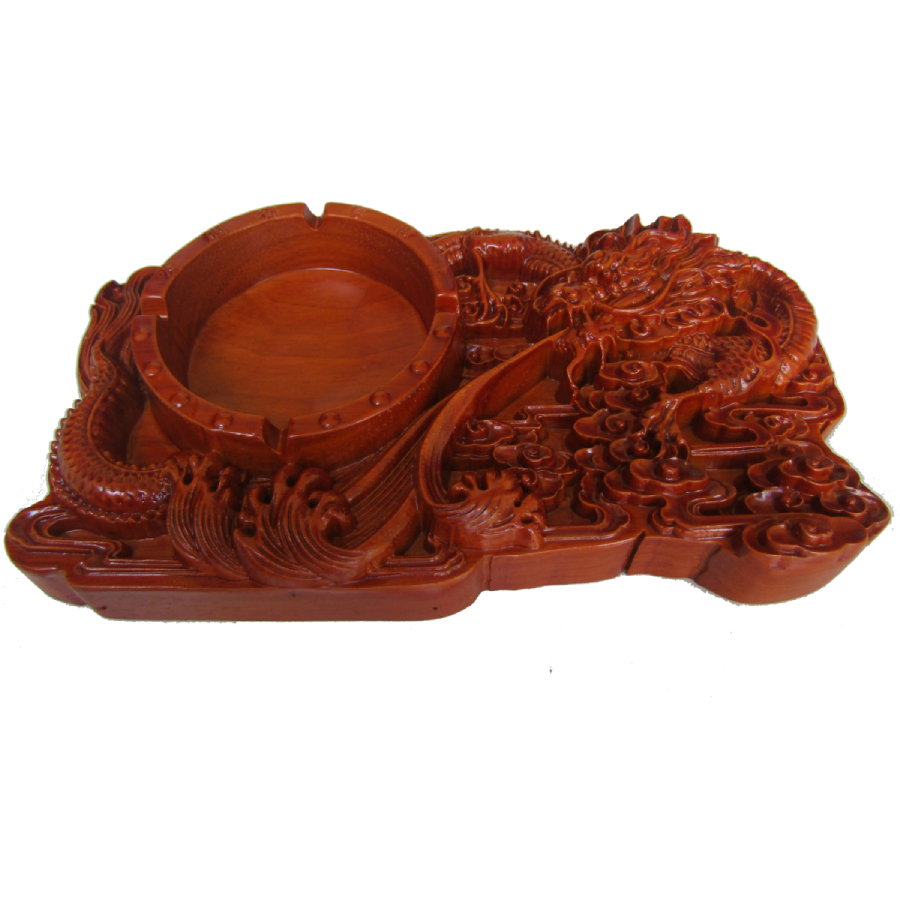 Gạt tàn bằng gỗ nguyên khối sơn phu bóng đẹp chạm rồng phun lửa, cá chép, rồng phượng rất tinh xảo