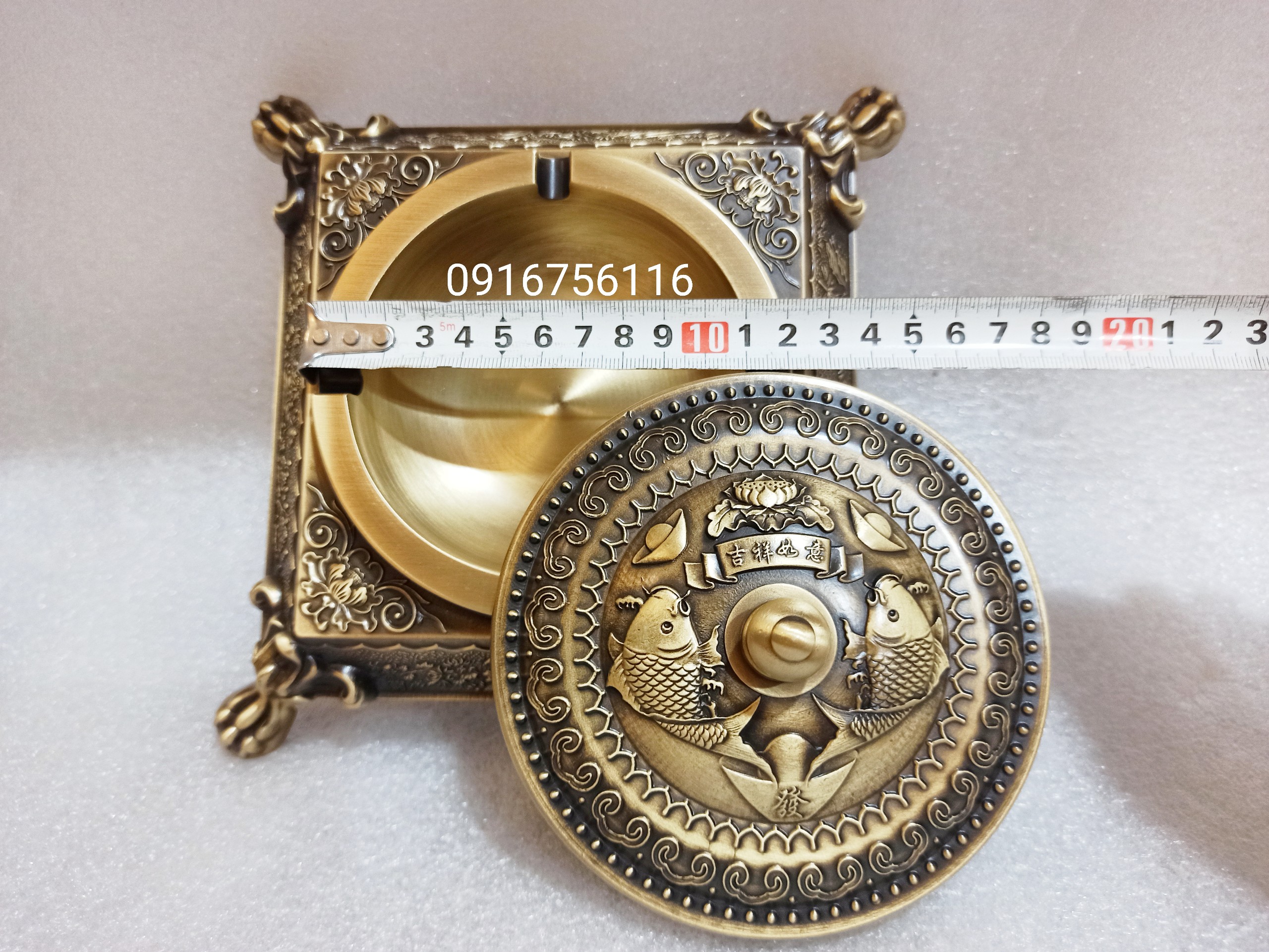 Kích thước 20x20x9.5 (cao đến chỏm nắp), - Chất liệu: đồng