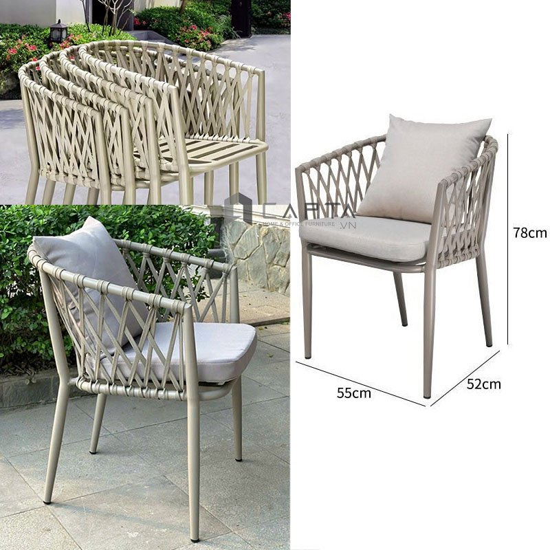 - Kích thước: 550520780 mm Ghế xếp chồng tiện lợi lưu trữ kho. Phù hợp ghế nhà hàng, ghế cafe, ghế hồ bơi, ghế sân vườn,… Nội thất Capta giới thiệu sản phẩm ghế ngoài trời dây dù nệm vải phong cách tân cổ điển mang màu sắc mới cho không gian. Với thiết kế đặc thù và sử dụng chất liệu chuyên dụng ngoài trời, khách hàng có thể an tâm sử dụng sản phẩm mà không cần lo ngại mưa nắng ảnh hưởng tới độ bền. Mẫu ghế CC2030-A khung nhôm liền tay tựa cứng chắc. Khung ghế sơn tĩnh điện màu xám xanh dịu nhẹ. Lưng ghế được tạo thành từ các sợi dây dù đan chéo là điểm nhấn trang trí cho mẫu ghế outdoor này. Bên cạnh đó, ghế được trang bị nệm lưng và nệm ngồi rời bằng vải xám. Loại vải sử dụng được ngoài trời có khả năng chống thấm nước, dễ dàng vệ sinh. Mút nệm tạo độ êm. Đặc biệt ghế dây dù CC2030-A xếp chồng lên nhau giúp tiện cho việc lưu kho cũng như tiết kiệm diện tích không gian khi không có nhu cầu sử dụng. Mỗi cạnh chân ghế đều được gắn nút nhựa đen không gây trầy sàn và hạn chế tiếng ồn khi bạn kéo đẩy ghế. Ghế cafe thư giãn ban công có gối nệm CC2030-A Nội thất Capta