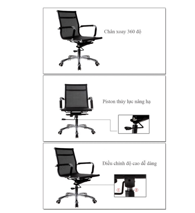 Cao 88 – 93 cm Lưng ghế thấp Thân ghế bằng thép mạ crom tựa lưng lưới, có gật gù Piston thủy lực