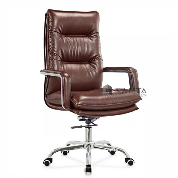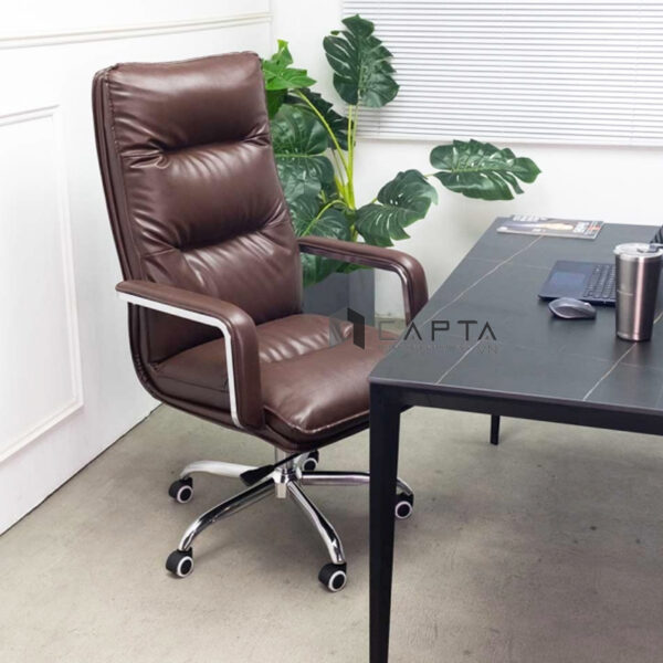 - Ghế lưng cao nệm nâu sang trọng, nệm ghế dày êm ái, kiểu dáng cổ điển phù hợp vị trí quản lý Giám đốc hoặc Trưởng phòng độ tuổi trung niên. Khi lựa chọn ghế văn phòng, điều đầu tiên chúng ta quan tâm đến là kiểu dáng và màu sắc phù hợp với từng độ tuổi. Đối với những quản lý tuổi trung niên nên chọn những mẫu ghế kiểu cổ điển, màu sắc trầm lắng. Điển hình là mẫu ghế Giám đốc da PU mềm nhập khẩu sau đây đáp ứng đủ các điều kiện trên. Hãy cùng Nội Thất Capta tìm hiểu chi tiết nhé! Nệm da công nghiệp PU bóng, bắt ánh sáng tốt. Ưu điểm của da PU là mềm và bền hơn chất liệu simili. Bề mặt da PU rất dễ lau chùi giúp tiết kiệm thời gian vệ sinh ghế. Nệm ghế dày mang lại cảm giác êm ái, thoải mái hơn khi ngồi lâu. Tay ghế thép mạ chrome ốp da PU cùng màu nệm ghế phần tiếp xúc. Điều này mang lại cảm giác êm ái cho khuỷu tay khi tựa. Chân thép mạ chrome sáng bóng tăng sự sang trọng. Bánh xe nhựa tính trượt tốt, dễ dàng di chuyển trong quá trình làm việc. Ghế nâng hạ chiều cao nhờ vào pen ghế có cơ chế lực đẩy và sức ép cân nặng. Lưng ghế ngả gật gù thư giãn. Phù hợp vị trí quản lý ghế Sếp trung niên, ghế Giám đốc cổ điển, ghế làm việc tại nhà,…
