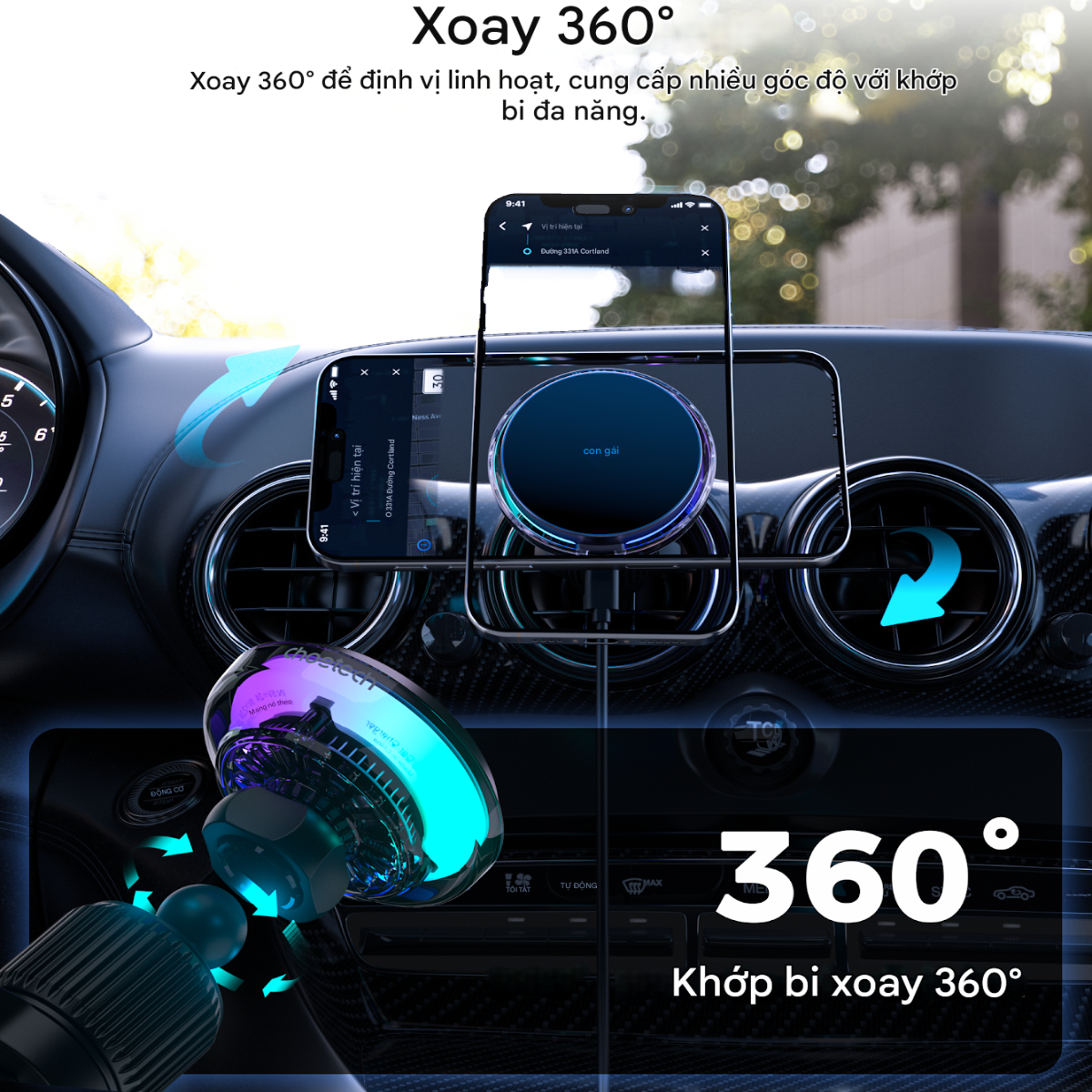 – Đầu xoay linh hoạt 360 độ giúp bạn dễ dàng điều chỉnh góc nhìn tối ưu, đảm bảo an toàn và tiện lợi khi sử dụng bản đồ hoặc nghe gọi.