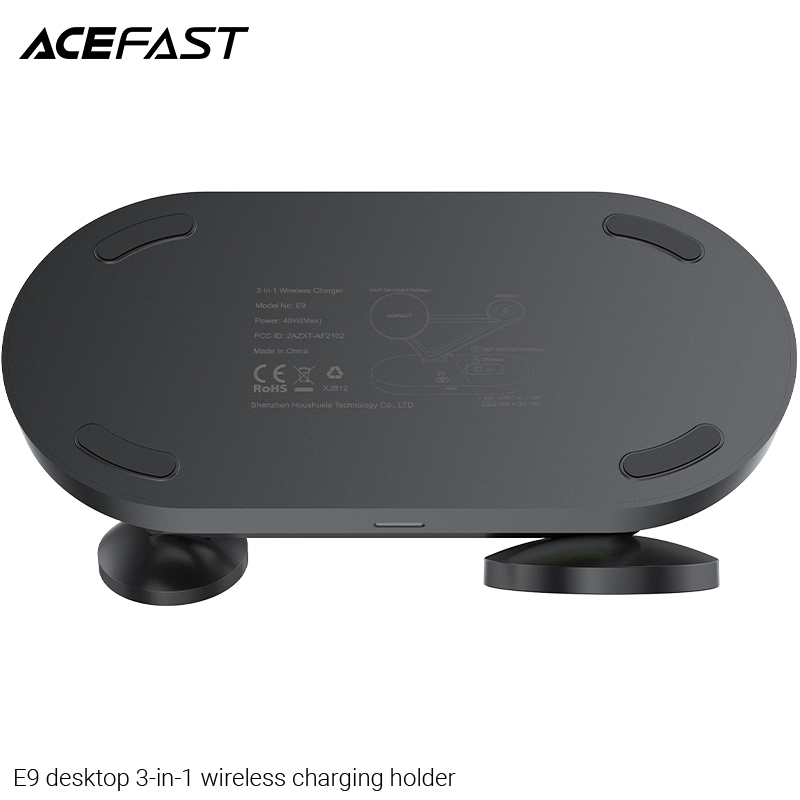 Mua tại Tiktok*Lưu ý: Đế sạc phù hợp với các thiết bị có hỗ trợ sạc không dây, riêng chức năng sạc mag.safe chỉ hỗ trợ cho các dòng từ i.phone 12 series trở lên và các dòng tai nghe có hỗ trợ sạc mag.safe. Lực hút từ tính chỉ hỗ trợ tốt khi sử dụng ốp lưng có độ dày <=5mm Giá đỡ sạc không dây để bàn 3 in 1 ACEFAST E9 Thông số kỹ thuật: - Input : ≥ 18W - Output: