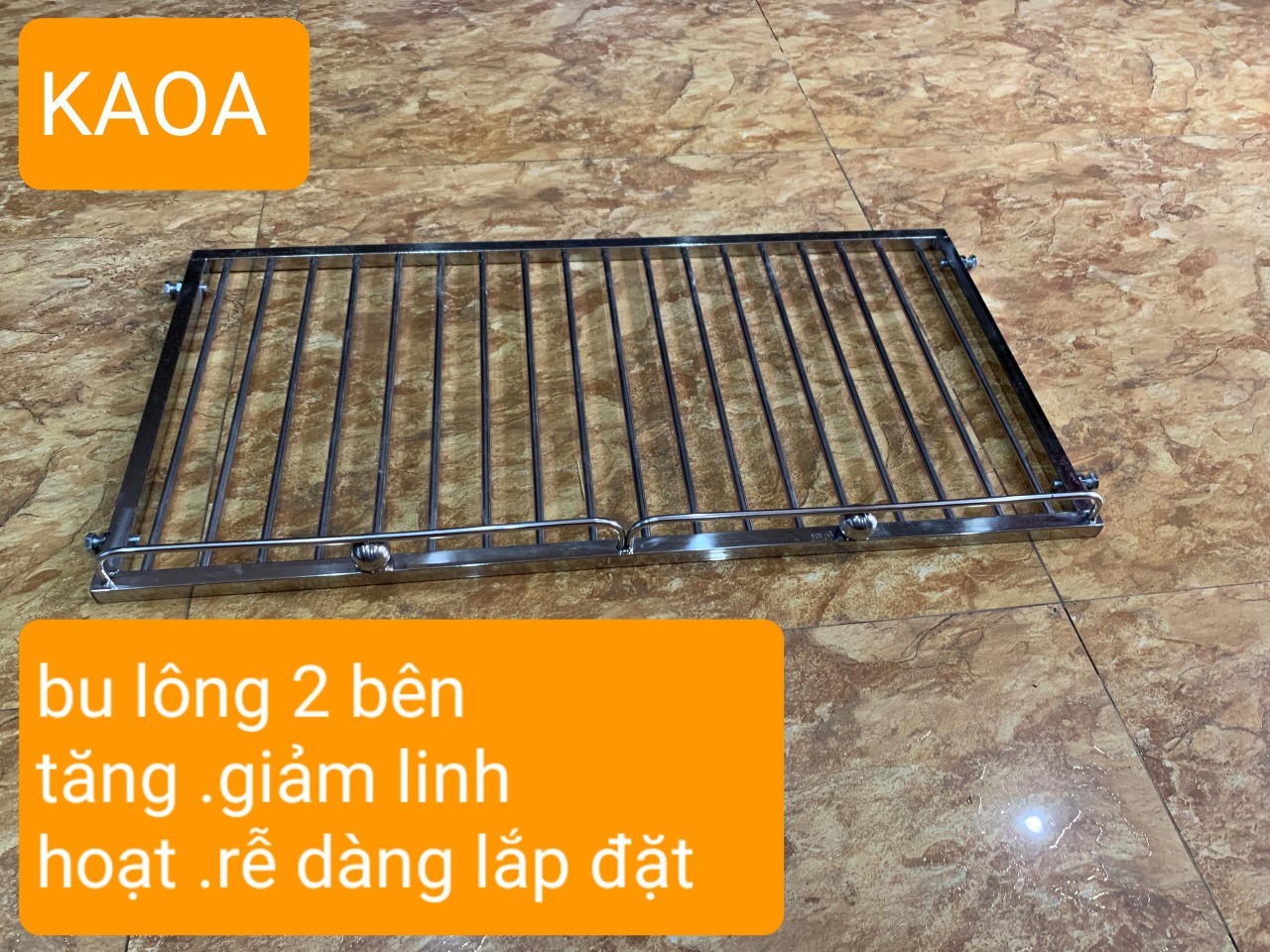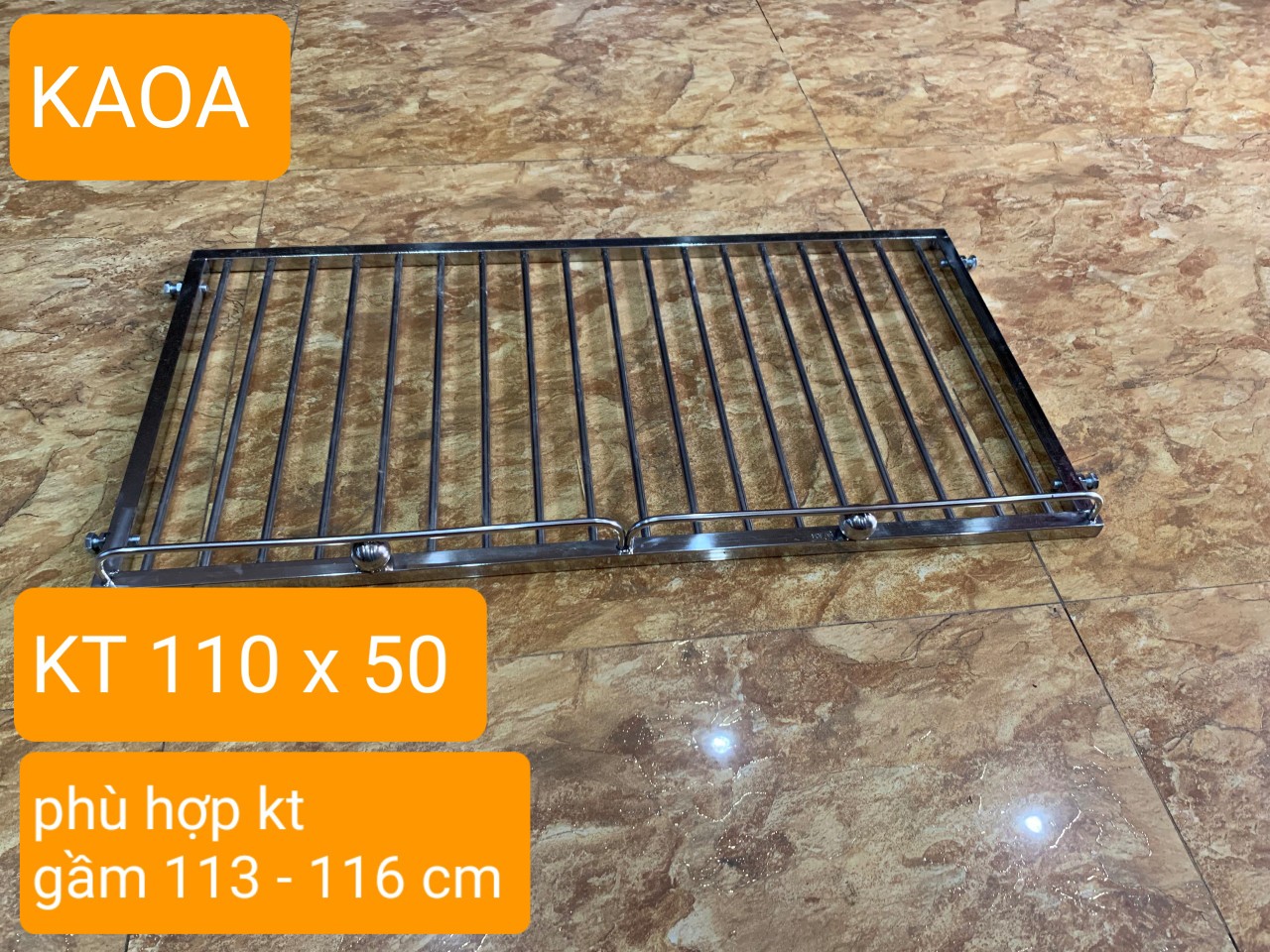 - / kích thước giá. rộng x sâu . 110 x 50 cm ( không tính bulong) 3./ sp được thiết kế thông minh với 4 bulong 2 bên rễ dàng tăng chỉnh linh hoạt theo kích thước dao động cho phép 4./ công năng . sử dụng chủ yếu xoong nồi . bát đĩa . rổ giá ác vận dụng nhà bếp vv 5./ khoảng cách nan phi 4 cm LƯU Ý BẮT BUỘC.... kích thước giá 110 cm sẽ phù hợp với kích thước lắp đặt dao động từ 113 - 116 cm ƯU ĐIỂM ́ inox nhà bếp thông minh (KAOA) có thể rễ dàng tháo .lắp linh hoạt mỗi khi vệ sinh không gian phòng bếp cách lắp đặt đơn giản không cần thợ