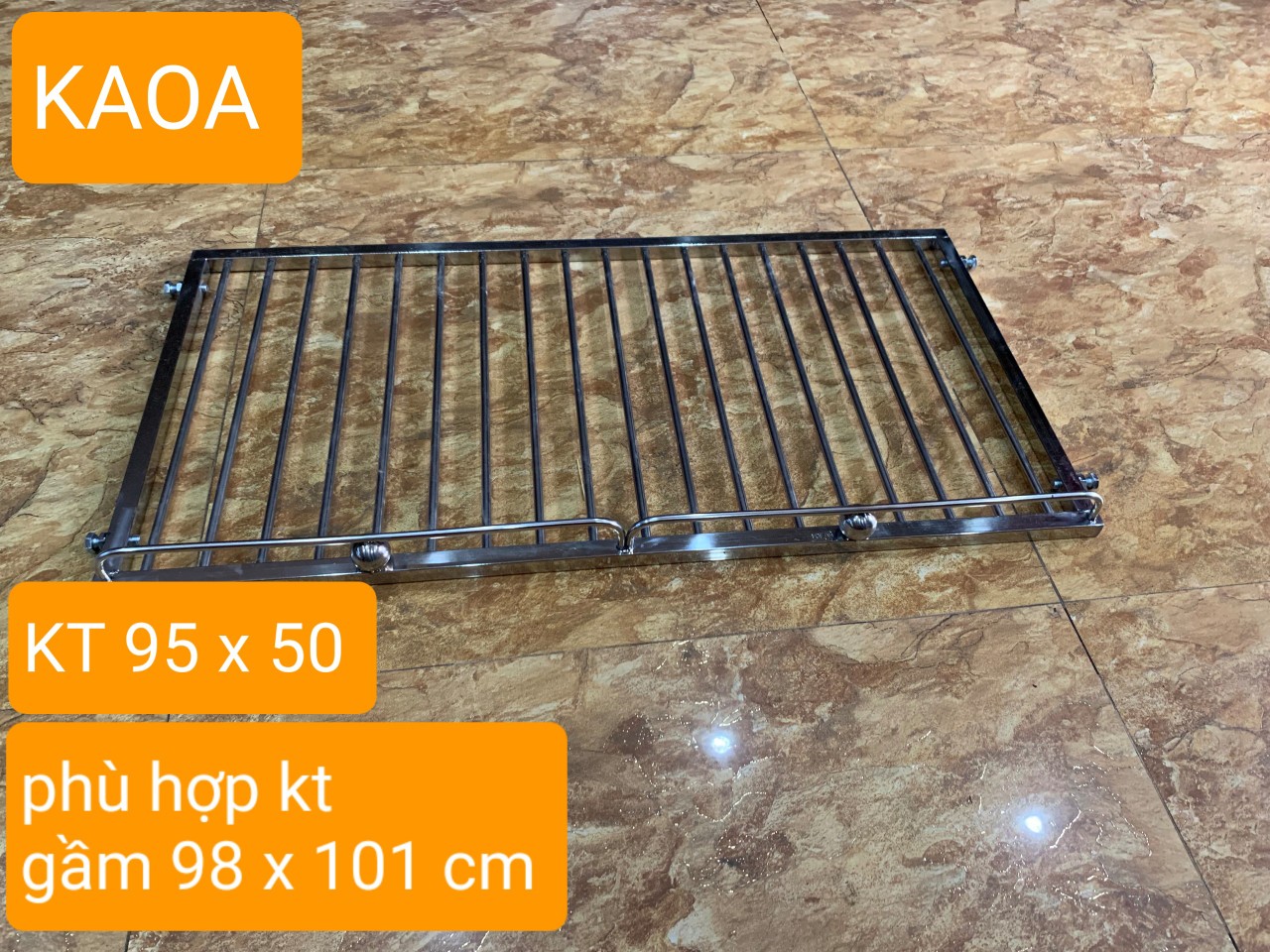 - / kích thước giá. rộng x sâu . 95 x 50 cm ( không tính bulong) 3./ sp được thiết kế thông minh với 4 bulong 2 bên rễ dàng tăng chỉnh linh hoạt theo kích thước dao động cho phép 4./ công năng . sử dụng chủ yếu xoong nồi . bát đĩa . rổ giá các vận dụng nhà bếp vv 5./ khoảng cách nan phi 4 cm LƯU Ý BẮT BUỘC... kích thước giá 95 cm sẽ phù hợp với kích thước lắp đặt dao động từ 98 - 101 cm ƯU ĐIỂM ́ inox nhà bếp thông minh (KAOA) có thể rễ dàng tháo .lắp linh hoạt mỗi khi vệ sinh không gian phòng bếp cách lắp đặt đơn giản không cần thợ