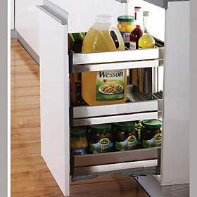 Giá đa năng để giao thớt, chai lọ, gia vị Chất liệu: Inox 304 dạng nan tròn Phiên bản bắt cánh ngăn kéo và mở cánh Ray âm giảm chấn Angas Độ rộng cánh: 300mm