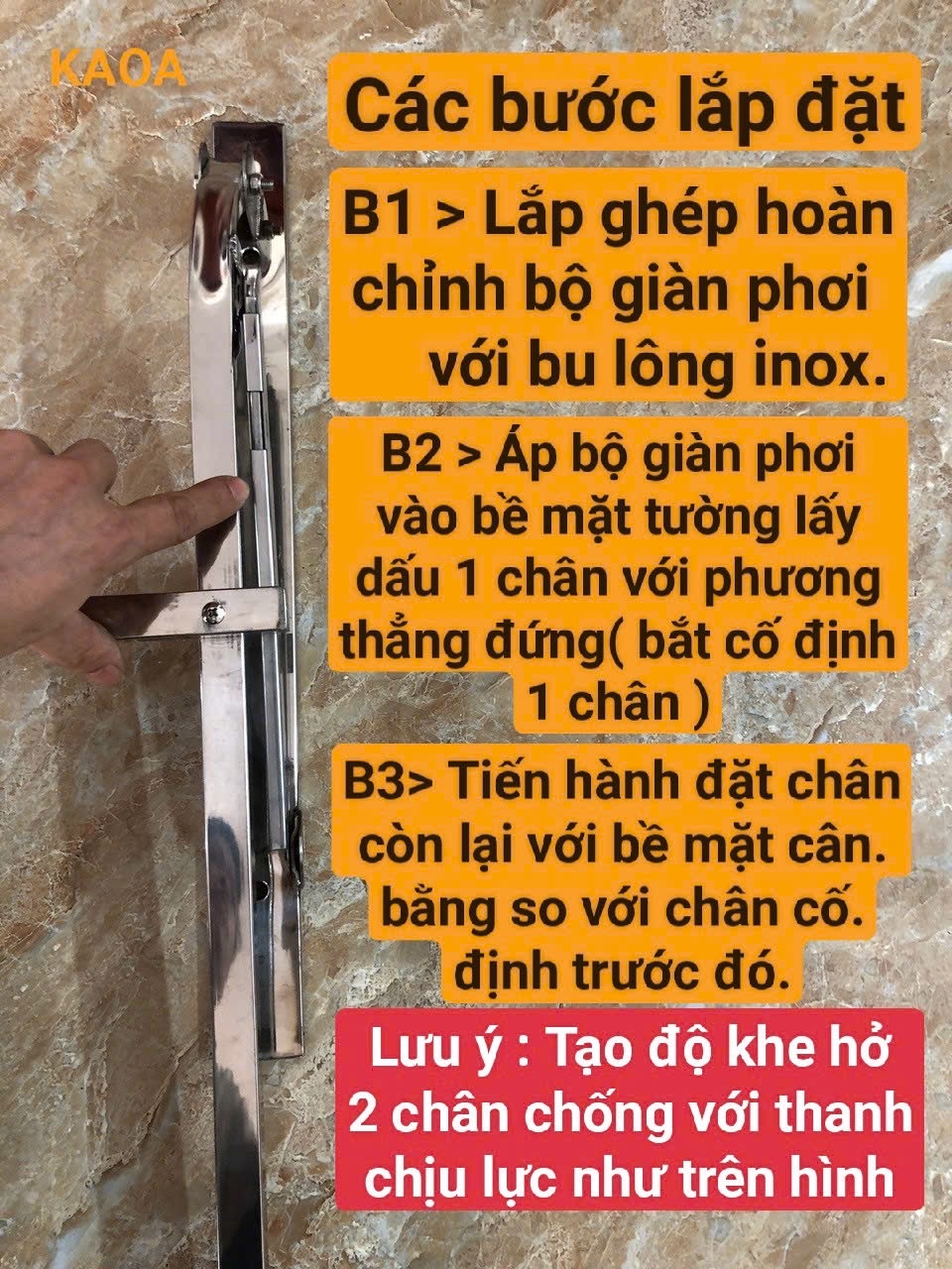 CTY CP SX INOX KAOA chuyên thiết kế .tư vấn và sx các sp về chất liệu inox . Cảm ơn quý khách hàng đã ghé thăm và quan tâm sp .KAOA luôn luôn cố gắng đảm bảo chất lượng sp để đem lại những trải nghiệm cũng như sự tin dùng sp của mỗi khách hàng ️️️️️ SP GIÀN PHƠI CAO CẤP GẤP GỌN THẾ HỆ MỚI ️️️️️ khác hẳn với các loại giàn phơi cồng kềnh mất diện tích có thể lật đổ bất kỳ khi gập gió và bão. SP GIÀN PHƠI CAO CẤP GẤP GỌN THẾ HỆ MỚI KAOA giải pháp tối ưu cho không gian ngôi nhà tiếp kiệm tối đa diện tích không gian mang lại sự sang trọng và tinh tế, hiện đại. Thanh phơi quần áo cao cấp gấp gọn KAOA mang lại sự tiện lợi và thoải mái cho người dùng đồng thời cũng là một món đồ trang trí tinh tế trong không gian sống của bạn, cùng với sự thiết kế đặc biệt giúp bạn có thể lắp đặt ở bất kỳ vị trí nào trong ngôi nhà từ ban công kể cả lối ra vào hoặc cạnh khu vực cửa sổ và cửa ra vào với thao tác gấp gọn nhẹ nhàng theo chiều gập xuống và Giữ nguyên trạng thái cố định khi phơi quần áo trong trường hợp gập gió bão ☆☆☆☆☆ ƯU ĐIỂM 1./ Thiết kế thông minh với chân chống tự khóa 2./ tải trọng lên đến 40kg 3./ Với chất liệu 100% inox 304 không han rỉ 4./ Thiết kế cải tiến có thể rễ dàng gấp gọn theo phương thẳng đứng chỉ với 2s 5./ Đáp ứng mọi vị trí lắp đặt 6./ Giữ nguyên trạng thái cố định khi phơi quần áo trong trường hợp gập gió bão 7./ Không cần di chuyển hay bê vác chỉ với thác tác gấp gọn nhẹ nhàng 8./ Lựa chọn được nhiều các vị trí lắp đặt có ánh nắng và gió ☆☆☆☆☆ THÔNG SỐ KỸ THUẬT 1./ Thanh móc áo được sử dụng hộp vuông 20mm và được bo tròn các đầu đem lại sự sang trọng và an toàn cho sp 2./ bản cố định tường được sử dụng hộp 40 x 10 ( mm) 3./ giá phơi được liên kết bằng bu lông inox CÁCH SỬ DỤNG 1./ Chọn vị trí ,chiều cao phù hợp để lắp đặt khi sử dụng phơi đồ B1>> Lắp ghép hoàn chỉnh bộ giàn phơi với bu lông đi kèm B2>> Áp bộ giàn phơi vào bề mặt tường lấy dấu và cố định 1 chân với phương thẳng đứng B3>> Tiến hành đặt chân còn lại với bề mặt cân bằng so với chân được cố định trước đó LƯU Ý TẠO ĐỘ KHE HỞ SONG SONG GIỮA CHÂN CHỐNG VÀ THANH CHỊU LỰC ( vui lòng xem trên ảnh) --- SP ĐƯỢC BẢO HÀNH 24 THÁNG SỬ DỤNG --- CAM KẾT BẢO HÀNH NHƯ SAU. SP không đúng kích thước. SP không đúng chất liệu inox 304. SP bị hư hại do chưa đạt yêu cầu về mối hàn dẫn đến bung .gẫy được đổi mới hoàn toàn trong thời gian bảo hành và không có bất kỳ phí phát sinh nào trong thời gian được bảo hành sp