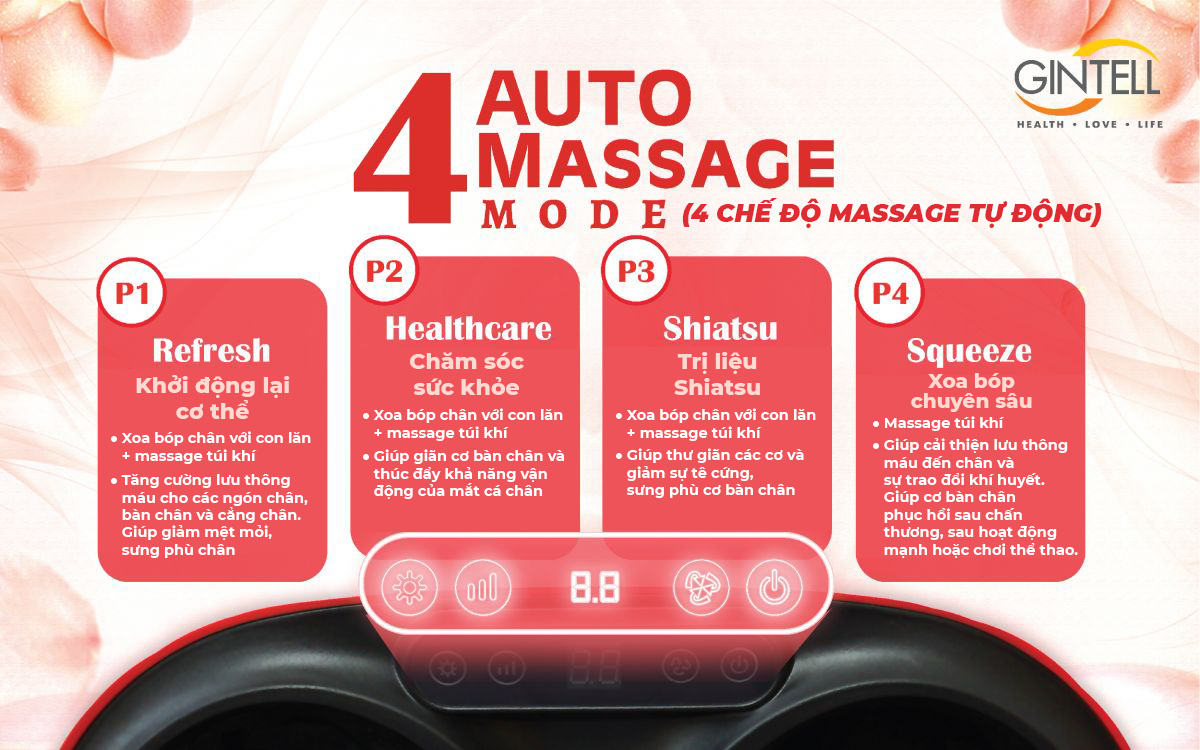• 4 chế độ máy massage tự động tích hợp nhiệt độ sưởi ấm lên đến 45 độ
