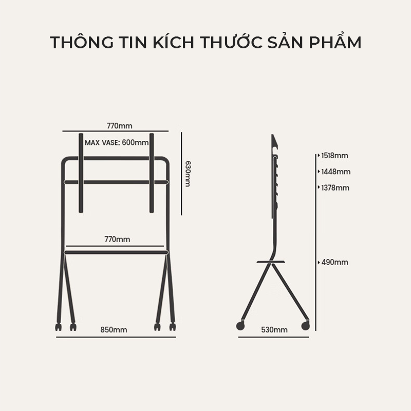 Công năng: Là mẫu giá treo tivi di động kèm kệ để đồ tiện lợi phù hợp nhiều không gian như phòng khách, phòng ngủ, phòng họp, phòng cộng đồng, ..