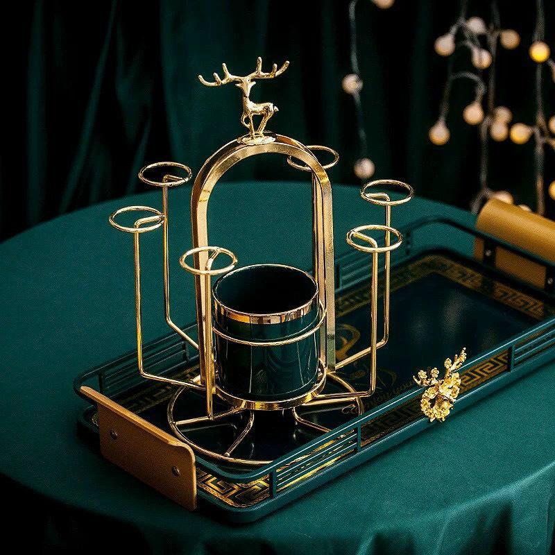 Khay úp cốc 6 chchân mẫu hươu mạ vàng có ống sứ cắm thìa dĩa