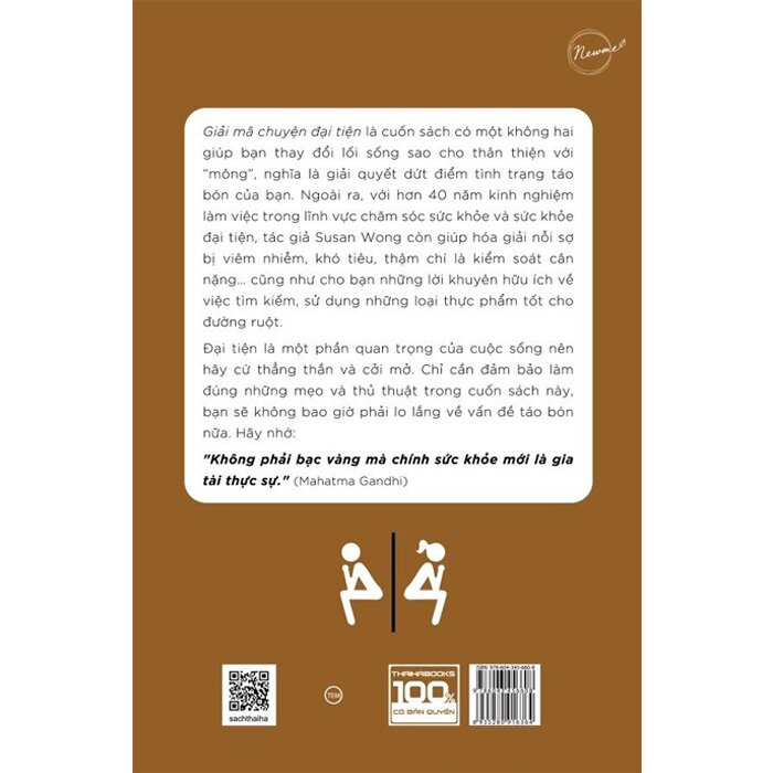 Giải mã chuyện đại tiện là cuốn sách có một không hai giúp bạn thay đổi lối sống sao cho thân thiện với “mông”, nghĩa là giải quyết dứt điểm tình trạng táo bón của bạn. Ngoài ra, với hơn 40 năm kinh nghiệm làm việc trong lĩnh vực chăm sóc sức khỏe và sức khỏe đại tiện, tác giả Susan Wong còn giúp hóa giải nỗi sợ bị viêm nhiễm, khó tiêu, thậm chí là kiểm soát cân nặng… cũng như cho bạn những lời khuyên hữu ích về việc tìm kiếm, sử dụng những loại thực phẩm tốt cho đường ruột.