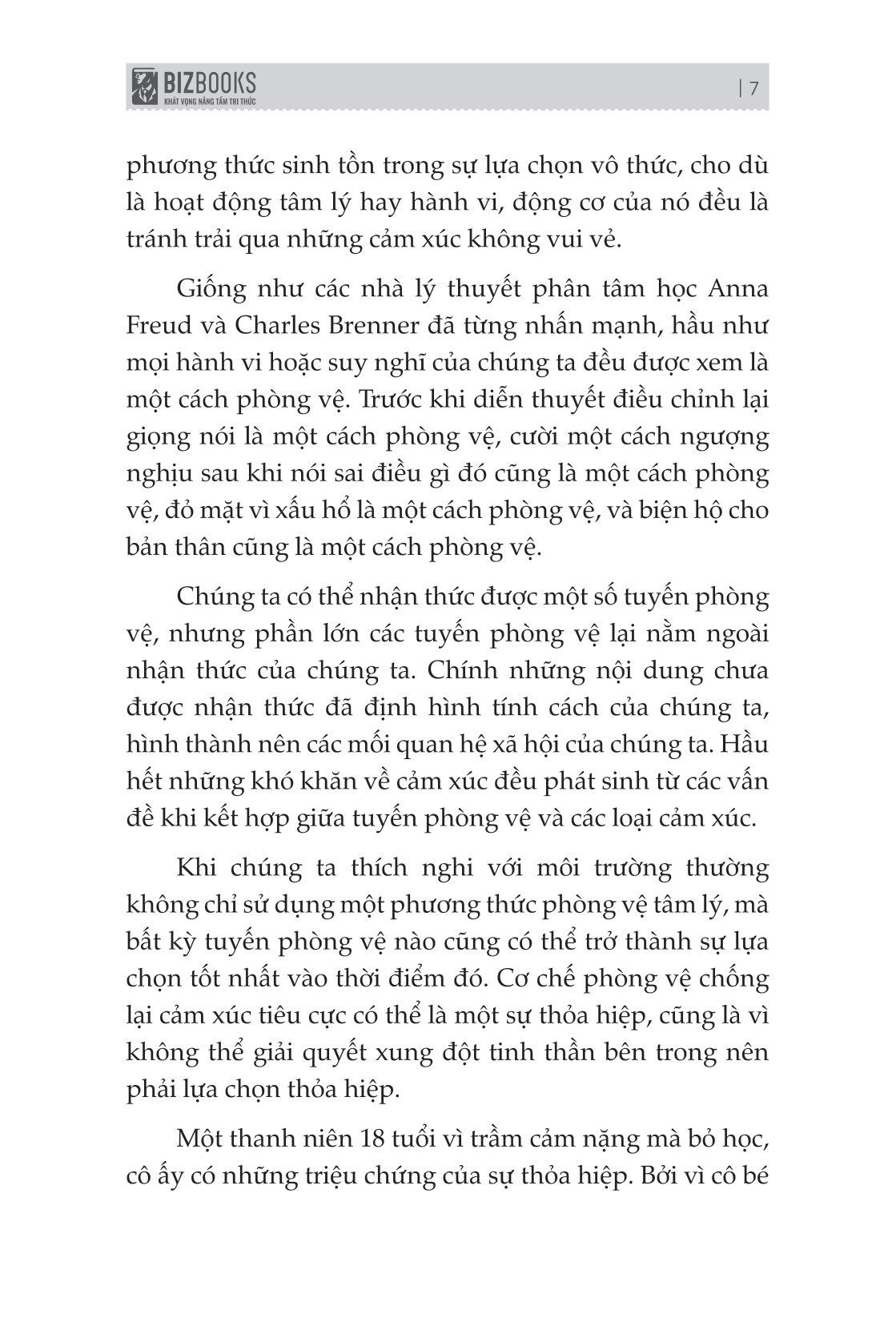Hầu hết những khó khăn về cảm xúc đều phát sinh từ sự kết hợp giữa khả năng phòng vệ và cảm xúc có vấn đề. Đôi khi, chúng ta sẽ bận tâm những chuyện nhỏ nhặt, dễ đi vào ngõ cụt và điều này sẽ thu hẹp nhận thức của chúng ta vì lúc này, chúng ta thường chỉ thấy một phần kết cục. Cuốn sách Giải mã cơ chế phòng vệ tâm lý con người sẽ giúp bạn thoát ra khỏi cảm xúc này và nhìn nhận lại tổng thể, cùng với đó là tìm được những nguồn lực của riêng m.ình và hướng sự chú ý của bạn vào những gì bạn sẽ làm để giải quyết mọi vấn đề. Khi đó, bạn sẽ thấy rằng mọi chuyện không tệ như bạn nghĩ và mọi việc đều có tính hai mặt của nó.