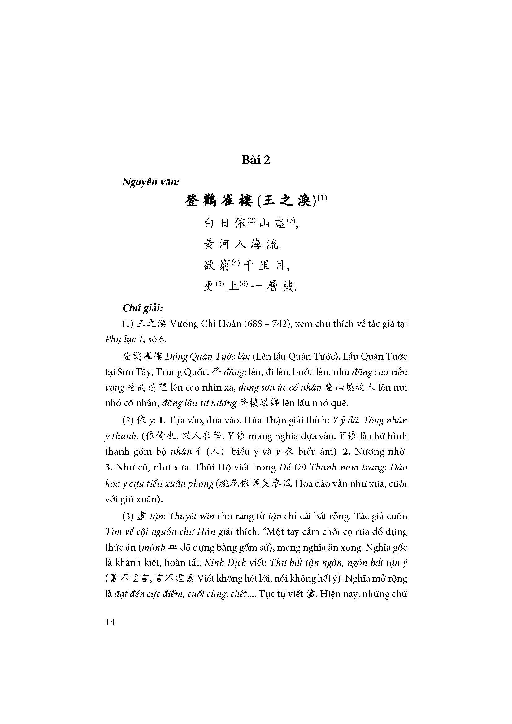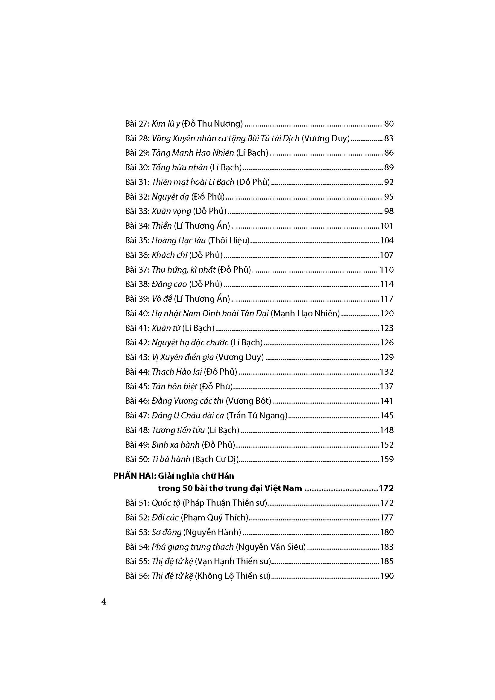 Bên cạnh đó, các Phụ lục trong cuốn sách này sẽ giúp bạn đọc tra cứu thêm các chữ Hán chưa được giải nghĩa trong từng bài thơ; tìm hiểu thêm về bộ thủ cũng như phần phiên âm, dịch nghĩa 100 bài thơ và bản dịch 50 bài thơ Đường; chỉ dẫn cách tra cứu khoảng 1500 chữ Hán được giải nghĩa trong cuốn sách, mỗi chữ Hán xuất hiện trong một ngữ cảnh cụ thể của tác phẩm.