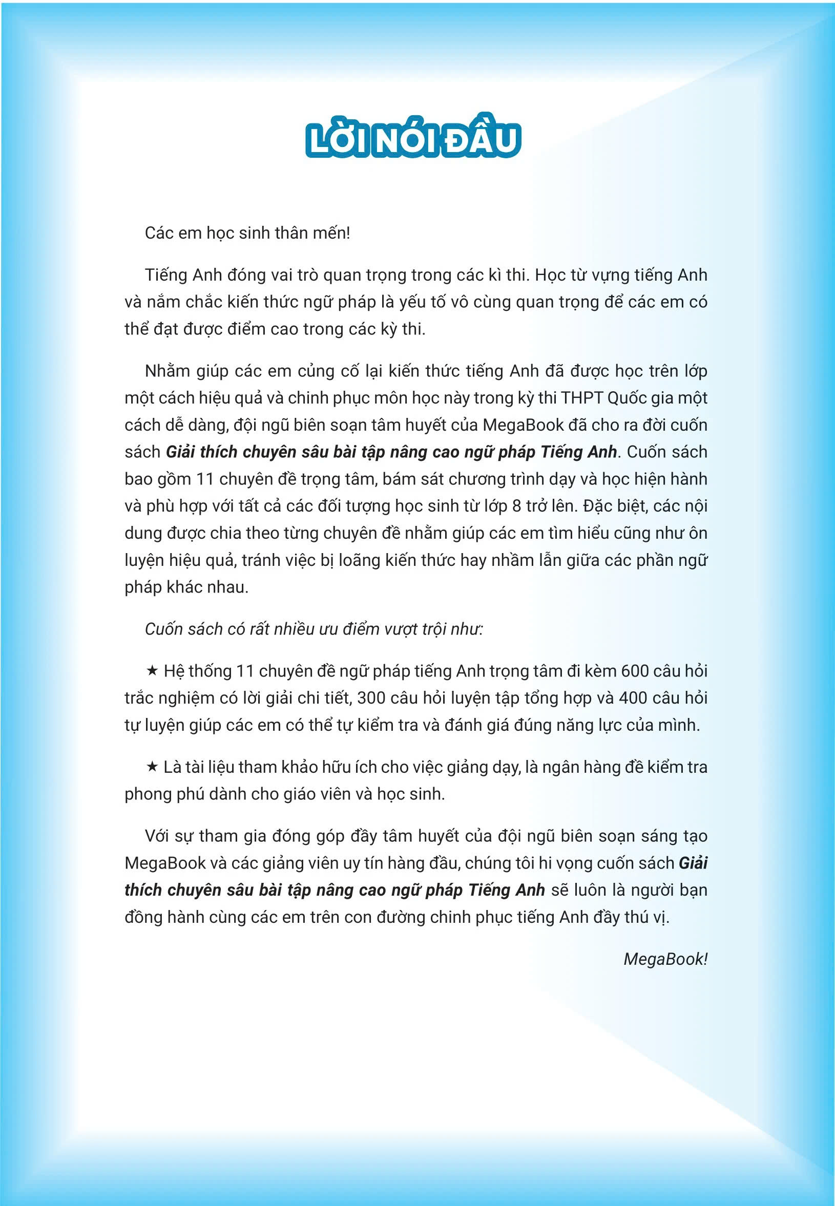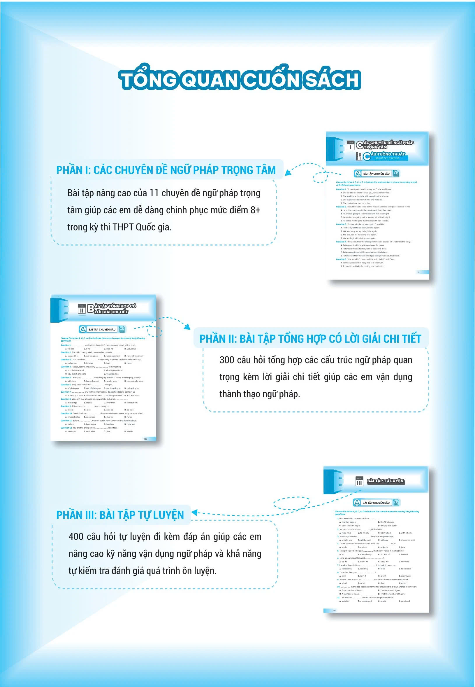 Cuốn sách cung cấp 600 câu hỏi trắc nghiệm với lời giải chi tiết, 300 câu hỏi luyện tập tổng hợp và 400 câu hỏi tự luyện. Điều này giúp học sinh có nhiều cơ hội thực hành và kiểm tra kiến thức, đảm bảo họ hiểu rõ ngữ pháp và có thể tự kiểm tra năng lực của mình.