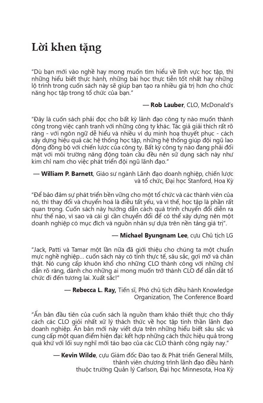 “Đây là cuốn sách phải đọc cho bất kỳ lãnh đạo công ty nào muốn thành công trong việc cạnh tranh với những công ty khác. Tác giả giải thích rất rõ ràng - với ngôn ngữ dễ hiểu và nhiều ví dụ minh hoạ thuyết phục - cách xây dựng hiệu quả các hệ thống học tập, những hệ thống giúp đội ngũ lao động đồng bộ với chiến lược của công ty. Bất kỳ công ty nào đang phải đối mặt với môi trường năng động toàn cầu đều nên sử dụng sách này như kim chỉ nam cho việc phát triển đội ngũ lãnh đạo.” - William P. Barnett, Giáo sư ngành Lãnh đạo doanh nghiệp, chiến lược và tổ chức, Đại học Stanford, Hoa Kỳ