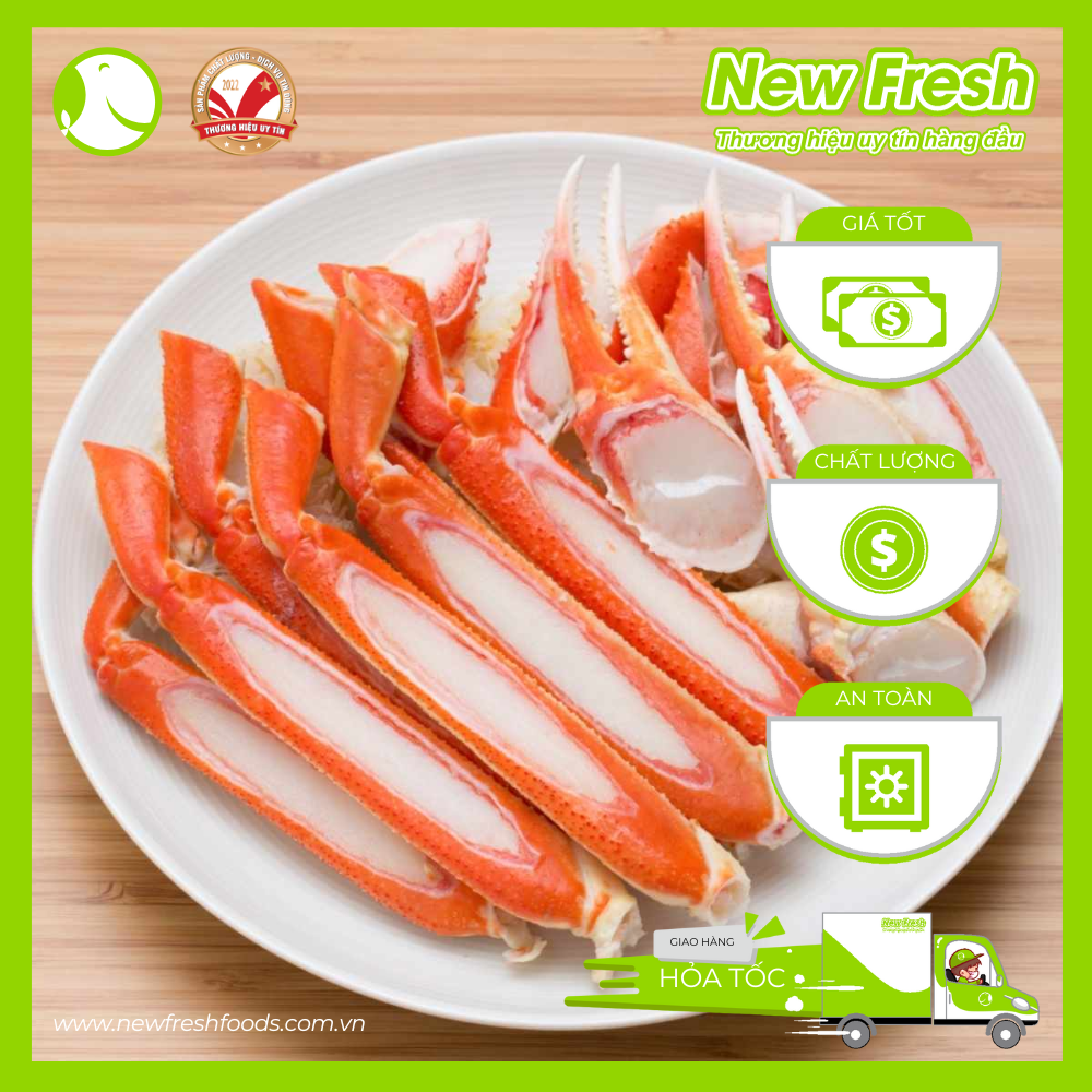 - Hạn sử dụng: 2 năm CHÂN CUA TUYẾT ALASKA ( Snow crab leg Alaska ) Chân cua tuyết Alaska là một loại Cua quý trên thế giới, chúng chỉ sống ở những vùng lạnh giá như một số vùng biển ở Canada, Mỹ và Nhật, độ sâu lớn cùng với nhiệt độ lạnh quanh năm nên vỏ có đặc tính cứng, chân to và dài để tự bảo vệ tốt nhất cho mình cũng như việc di chuyển nhanh tìm thức ăn. Đặc điểm của chân cua tuyết Là phần tách đôi của thân cua, được bảo quản lạnh theo đúng chuẩn để giữ độ ngọt, thơm của thịt cua. Chân cua tuyết Canada là món ăn với vị ngọt đậm đà, vừa ăn đã mê cái chất thịt trắng noãn như ngọt, mềm mại lại đủ giai đủ giòn, nhau lâu ngậm đủ vị bùi của thịt. Khi ăn chỉ cần bẻ nhẹ ở mỗi chân rồi rút phần thịt ra cực kì dễ dàng. Chân cua tuyết thịt dày và ngọt phù hợp cho các món như: Rang me, rang tỏi, sốt cajun, sốt me, rang chà bông, hấp nóng, hấp nuớc dừa chấm muối chanh Giá trị dinh dưỡng của Chân Cua Tuyết Chân cua tuyết Canada không chỉ là món ăn phổ biến trên thực đơn hải sản với chất thịt ngọt, thơm và dai, mà nó còn cung cấp cho chúng ta nhiều lợi ích cho sức khỏe:
