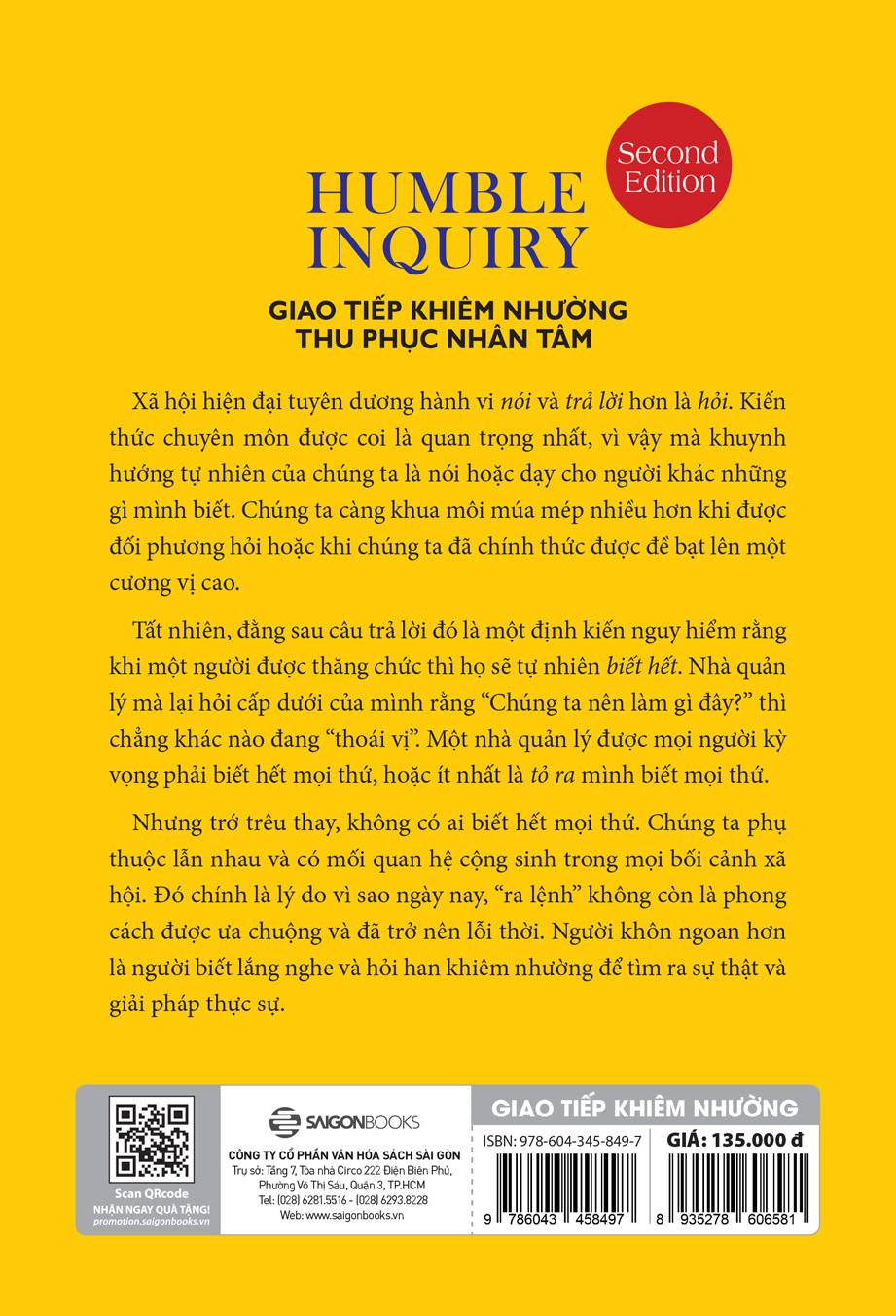 Quyển sách Humble Inquiry: The Gentle Art of Asking Instead of Telling này sẽ đào sâu vào những câu hỏi như: Những yếu tố văn hóa, xã hội và tâm lý nào đang cản trở chúng ta đón nhận và sử dụng phương pháp này? Nếu muốn hỏi han khiêm nhường thành công thì chúng ta phải quên đi những bài học nào và học lại những bài học nào? Nó cũng thảo luận về những tác động thường trực của văn hóa lên chúng ta, cũng như sẽ chứng minh cách mà văn hóa ngầm khuyến khích ta phát biểu ý kiến và cản trở việc hỏi han khiêm nhường.