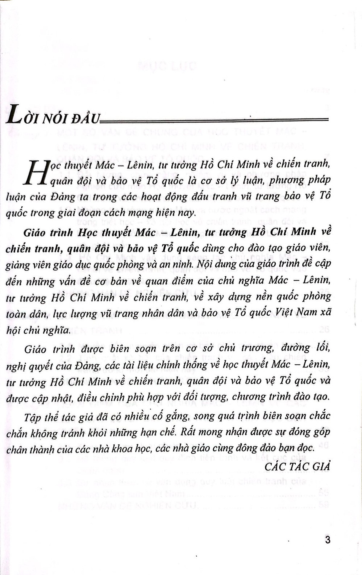 Học thuyết Mác – Lênin, tư tưởng Hồ Chí Minh về chiến tranh, quân và bảo Tổ quốc là cơ sở lý luận, phương pháp luận của Đảng ta trong các hoạt động đấu tranh vũ trang bảo vệ Tổ quốc trong giai đoạn cách mạng hiện nay. Giáo trình Học thuyết Mác – Lênin, tư tưởng Hồ Chí Minh về chiến tranh, quân đội và bảo vệ Tổ quốc dùng cho đào tạo giáo viên, giảng viên giáo dục quốc phòng và an ninh. Nội dung của giáo trình đề cập đến những vấn đề cơ bản về quan điểm của chủ nghĩa Mác Lênin, - tư tưởng Hồ Chí Minh về chiến tranh, về xây dựng nền quốc phòng toàn dân, lực lượng vũ trang nhân dân và bảo vệ Tổ quốc Việt Nam xã hội chủ nghĩa. Giáo trình được biên soạn trên cơ sở chủ trương, đường lối, nghị quyết của Đảng, các tài liệu chính thống về học thuyết Mác – Lênin, tư tưởng Hồ Chí Minh về chiến tranh, quân đội và bảo vệ Tổ quốc và được cập nhật, điều chỉnh phù hợp với đối tượng, chương trình đào tạo. Tập thể tác giả đã có nhiều cố gắng, song quá trình biên soạn chắc chắn không tránh khỏi những hạn chế. Rất mong nhận được sự đóng góp chân thành của các nhà khoa học, các nhà giảo cùng đông đảo bạn đọc.