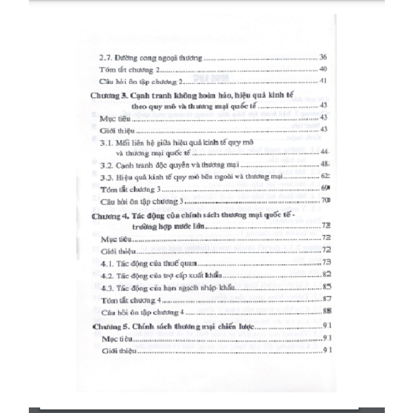 Từ chương 4 đến chương 6 là chính sách thương mại quốc tế với các nội dung như: tác động của chính sách thương mại quốc tế trong trường hợp nước lớn; chính sách thương mại chiến lược; chính sách thương mại của các nền kinh tế đang phát triển.