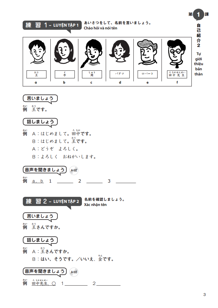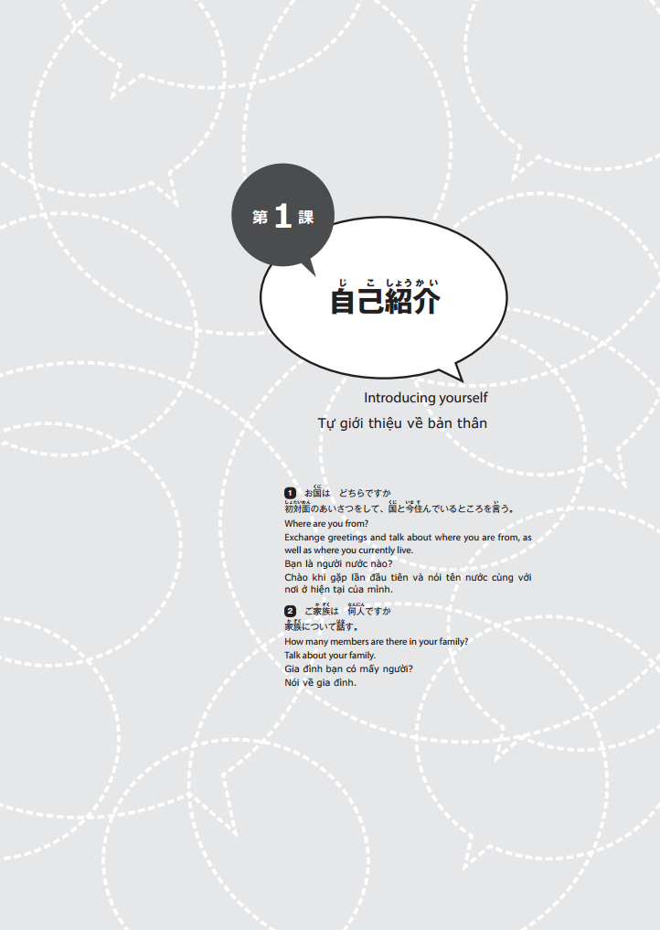 Seri Giáo trình tiếng Nhật tổng hợp dành cho người Việt gồm hai tập và tương ứng sẽ có giáo trình “luyện tập và ngữ pháp” kèm theo. Cả bộ giáo trình gồm 2 tập với 22 bài học, mỗi bài học sẽ được thống nhất trong cùng một chủ đề. Các chủ đề được đưa ra bao gồm: Tự giới thiệu bản thân, mời, mua sắm, tiệc, bệnh viện, thăm hỏi, phỏng vấn, hỏi đường, sở thích, ấn tượng về Nhật Bản, về đất nước của bạn, du lịch, ước mơ trong tương lai, đồ ăn, sự kiện, giáo dục..v..v.