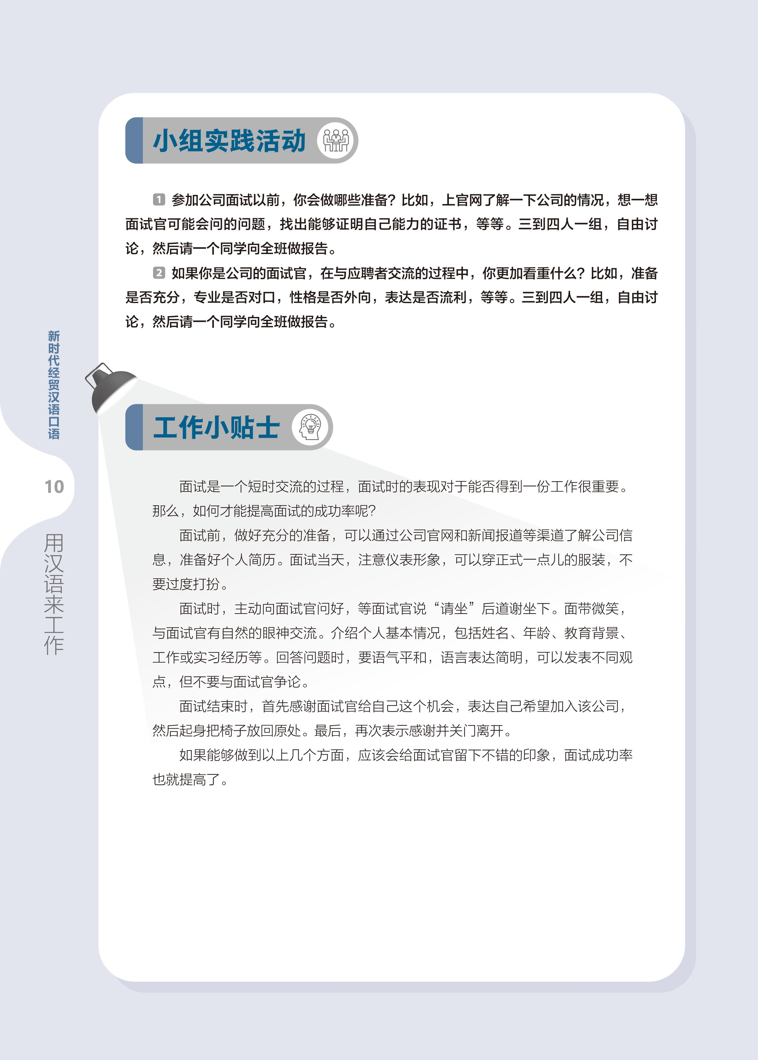 • Hoạt động thực hành nhóm: Thiết kế các hoạt động nói theo nhóm dựa trên chủ đề mỗi bài và vượt ra ngoài nội dung bài khóa. Người học thông qua phân công hợp tác, giúp đỡ lẫn nhau và thảo luận tự do, tăng cường ghi nhớ từ ngữ, mẫu câu trọng điểm và cách diễn đạt thường dùng, nâng cao khả năng giao tiếp khẩu ngữ.