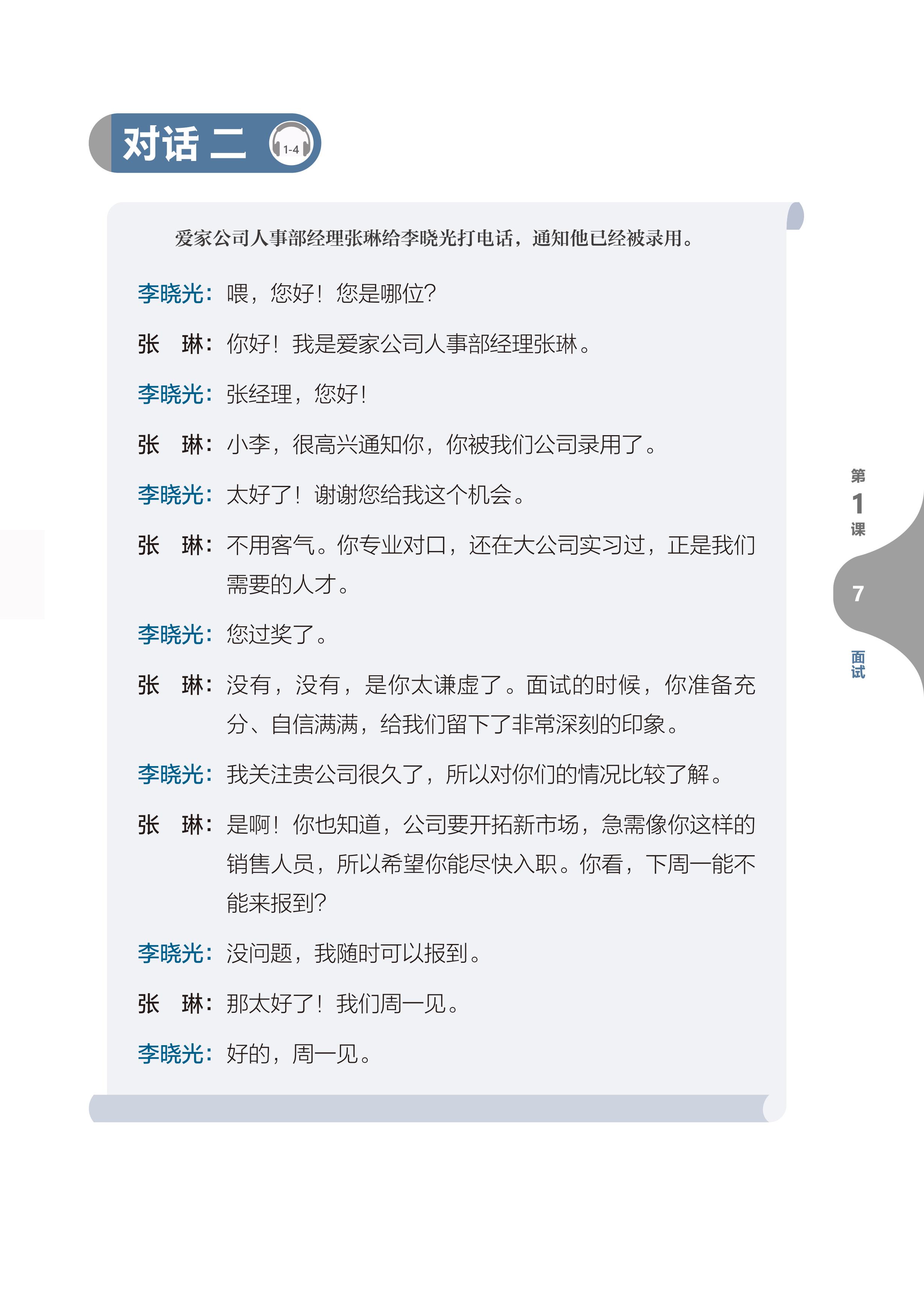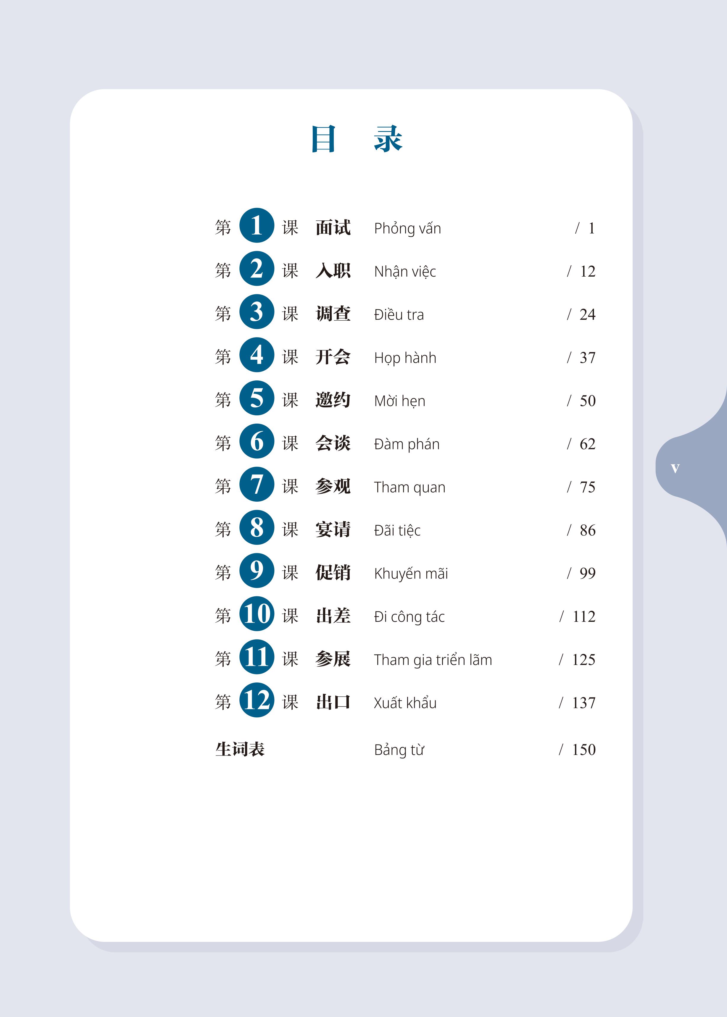 • Từ ngữ và Hội thoại: Nội dung cốt lõi của mỗi bài. Mỗi bài học hai đoạn hội thoại liên quan đến chủ đề bài học, thúc đẩy tình tiết câu chuyện phát triển, đồng thời nắm vững các từ ngữ trọng điểm liên quan, đặc biệt là các từ ngữ thường dùng trong môi trường kinh doanh.