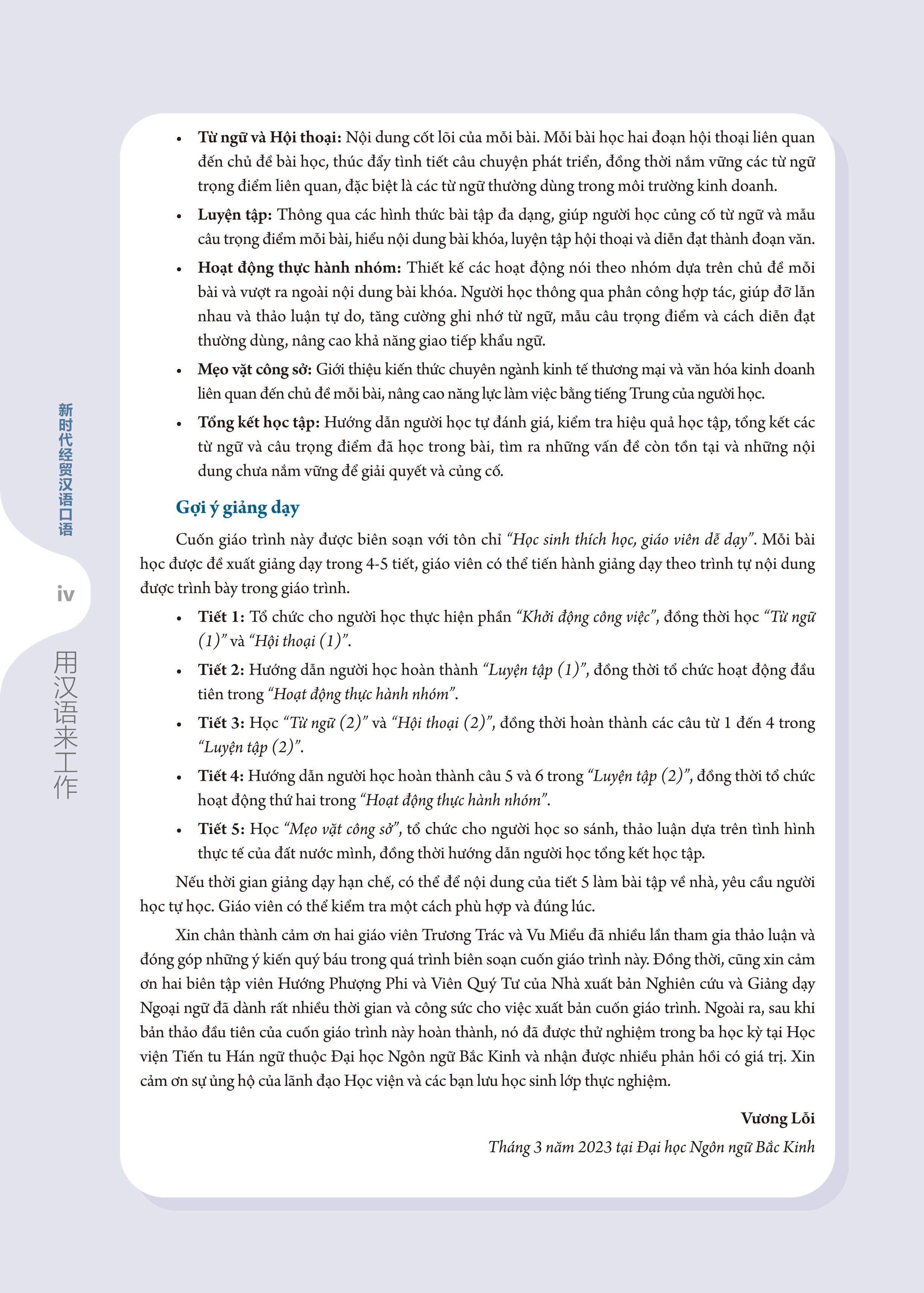 Những năm gần đây, cùng với sự phát triển không ngừng của kinh tế Trung Quốc, giao lưu giữa Trung Quốc và các nước trên thế giới trong lĩnh vực kinh tế thương mại ngày càng thường xuyên và sâu rộng, nhu cầu của cộng đồng quốc tế về nguồn nhân lực chuyên môn tiếng Trung trong lĩnh vực kinh tế thương mại - những người hiểu văn hóa kinh doanh Trung Quốc, quen thuộc với quy trình hợp tác thương mại và có thể sử dụng tiếng Trung để làm việc - cũng ngày càng cấp thiết. Để đáp ứng tốt hơn nhu cầu này, nhiều trường học đã mở các khóa học tiếng Trung kinh tế thương mại, đào tạo nhân tài có thể sử dụng tiếng Trung để làm công việc kinh doanh hoặc thương mại quốc tế, xây dựng cầu nối cho sự kết nối giữa các quốc gia. Chuỗi khóa học “Tiếng Trung giao tiếp thương mại” của Học viện Tiến tu Hán ngữ thuộc trường Đại học Ngôn ngữ Bắc Kinh đã được mở gần hai mươi năm, người biên soạn đã giảng dạy khóa học này tại Học viện hơn mười năm, tích lũy được nhiều kinh nghiệm về chương trình học và giảng dạy. Trong thực tiễn giảng dạy, chúng tôi đã lên kế hoạch biên soạn bộ “Giáo trình tiếng Trung giao tiếp thương mại Kỷ nguyên mới”, bao gồm hai tập: “Giáo trình tiếng Trung giao tiếp thương mại Kỷ nguyên mới: Tiếng Trung thực chiến trong công sở” tập trung vào ngôn ngữ kinh doanh trong công ty và “Giáo trình tiếng Trung giao tiếp thương mại Kỷ nguyên mới: Tiếng Trung thực chiến trong kinh doanh quốc tế” tập trung vào ngôn ngữ thương mại quốc tế.