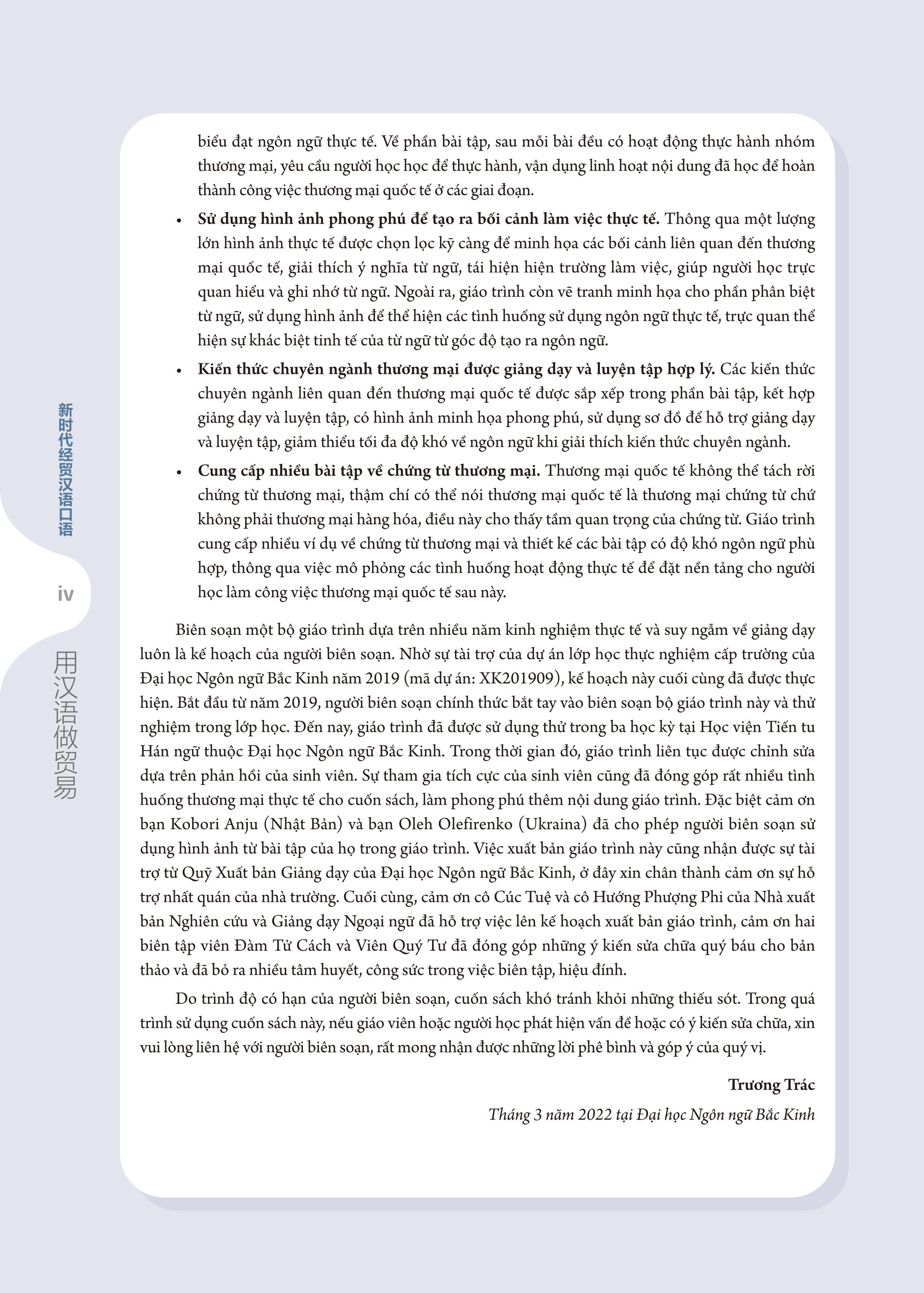 Những năm gần đây, cùng với sự phát triển không ngừng của kinh tế Trung Quốc, giao lưu giữa Trung Quốc và các nước trên thế giới trong lĩnh vực kinh tế thương mại ngày càng thường xuyên và sâu rộng, nhu cầu của cộng đồng quốc tế về nguồn nhân lực chuyên môn tiếng Trung trong lĩnh vực kinh tế thương mại - những người hiểu văn hóa kinh doanh Trung Quốc, quen thuộc với quy trình hợp tác thương mại và có thể sử dụng tiếng Trung để làm việc - cũng ngày càng cấp thiết. Để đáp ứng tốt hơn nhu cầu này, nhiều trường học đã mở các khóa học tiếng Trung kinh tế thương mại, đào tạo nhân tài có thể sử dụng tiếng Trung để làm công việc kinh doanh hoặc thương mại quốc tế, xây dựng cầu nối cho sự kết nối giữa các quốc gia. Chuỗi khóa học “Tiếng Trung giao tiếp thương mại” của Học viện Tiến tu Hán ngữ thuộc trường Đại học Ngôn ngữ Bắc Kinh đã được mở gần hai mươi năm, người biên soạn đã giảng dạy khóa học này tại Học viện hơn mười năm, tích lũy được nhiều kinh nghiệm về chương trình học và giảng dạy. Trong thực tiễn giảng dạy, chúng tôi đã lên kế hoạch biên soạn bộ “Giáo trình tiếng Trung giao tiếp thương mại Kỷ nguyên mới”, bao gồm hai tập: “Giáo trình tiếng Trung giao tiếp thương mại Kỷ nguyên mới: Tiếng Trung thực chiến trong công sở” tập trung vào ngôn ngữ kinh doanh trong công ty và “Giáo trình tiếng Trung giao tiếp thương mại Kỷ nguyên mới: Tiếng Trung thực chiến trong kinh doanh quốc tế” tập trung vào ngôn ngữ thương mại quốc tế.