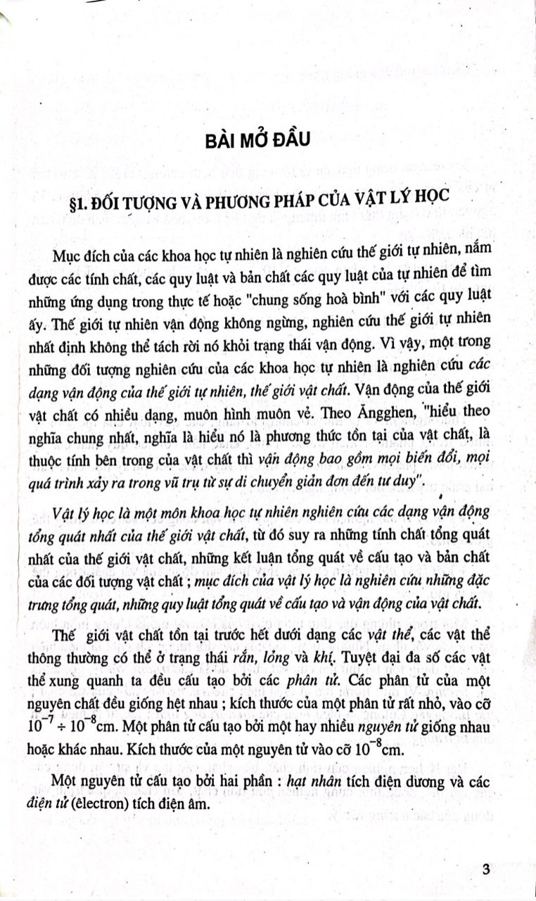 Thế giới và Thế giới vật chất tồn tại trước hết dưới dạng các vật thể, các vật thể thông thường có thể ở trạng thái rắn, lỏng và khí. Tuyệt đại đa số các vật thể xung quanh ta đều cấu tạo bởi các phân tử. Các phân tử của một nguyên chất đều giống hệt nhau ; kích thước của một phân tử rất nhỏ, vào cỡ -7 -8 10^7 + 10 cm. Một phân tử cấu tạo bởi một hay nhiều nguyên tử giống nhau -8 hoặc khác nhau. Kích thước của một nguyên tử vào cỡ 10 cm.
