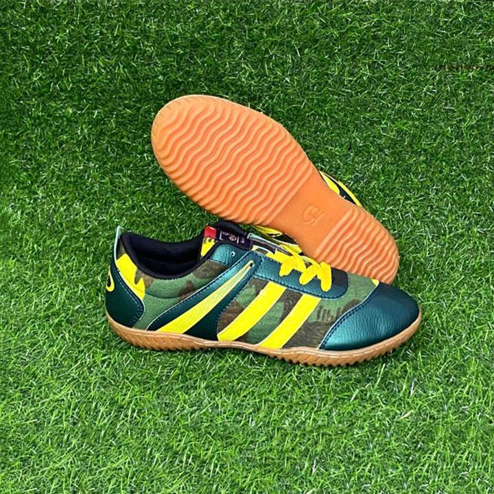 Giày đá bóng futsal mới màu xanh quân đôi cho độ bám sàn tốt cũng như có độ bền cùng độ dẻo dai cao, là chọn lựa lý tưởng của những bạn nam yêu thích thể thao. Đặc biệt, thiết kế chủ đạo màu chuối nổi bật bắt mắt cùng logo ấn tượng, làm toát lên phong cách mạnh mẽ của cầu thủ bóng đá.