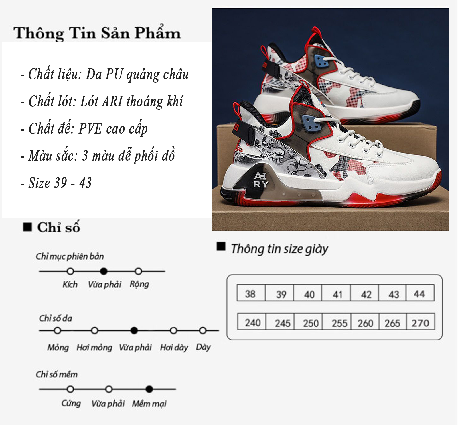 Thiết kế: có form giày Sneaker trẻ trung, năng động, phong cách cá tính Chất liệu: Phần trên của đôi giày được làm từ chất liệu da cao cấp và vải, mềm mại, giúp cho