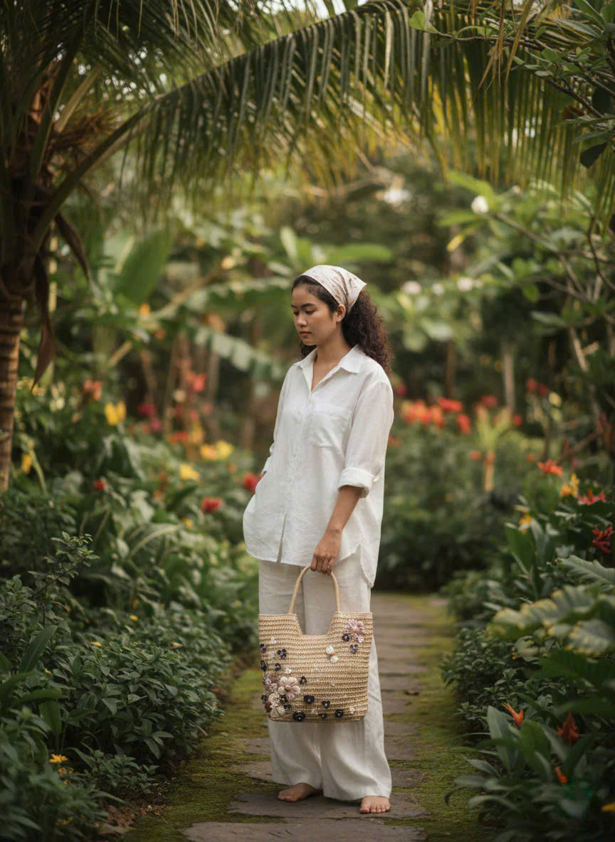 - Chất liệu giỏ: cói giấy, canvas - Chất liệu trang trí: vỏ sò, ốc đã qua xử lý chống ẩm mốc - Nghệ nhân trang trí: Minh Thu Từ mạch đất Mẹ, sự sống