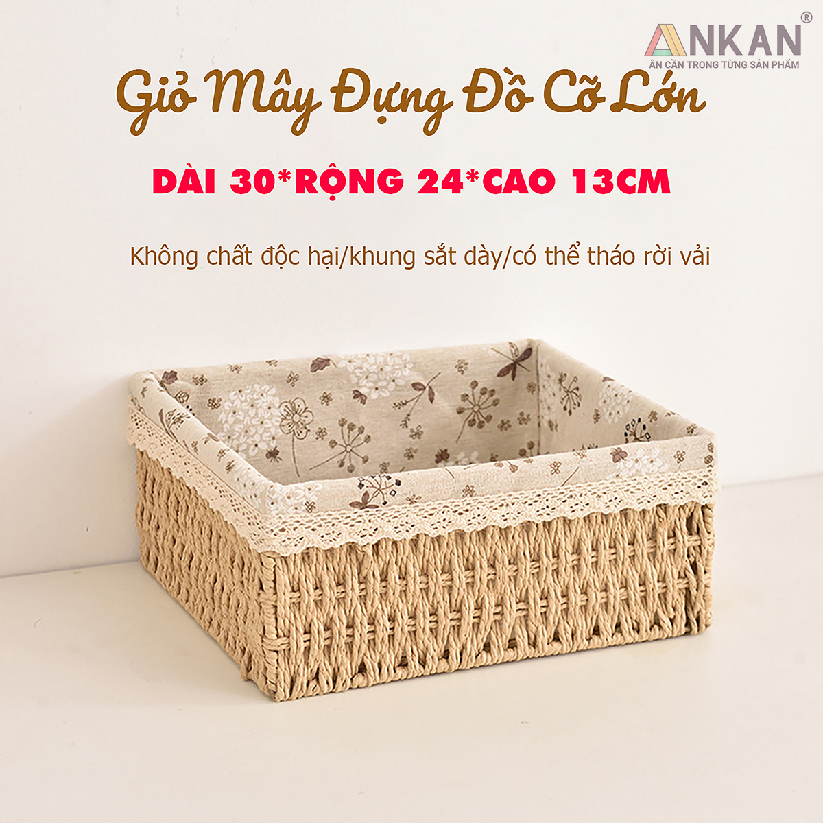 Mua tại TiktokGiỏ mây cỡ lớn đến từ thương hiệu ANKAN là lựa chọn lý tưởng cho những ai yêu thích sự gọn gàng, tinh tế và mang đậm phong cách vintage. Được đan tay tỉ mỉ từ dây giấy chắc chắn, giỏ có khung sắt dày giúp giữ form tốt, kết hợp cùng lớp vải lót hoa nhí có thể tháo rời – tiện lợi và dễ vệ sinh. ❁ Kích thước sản phẩm: