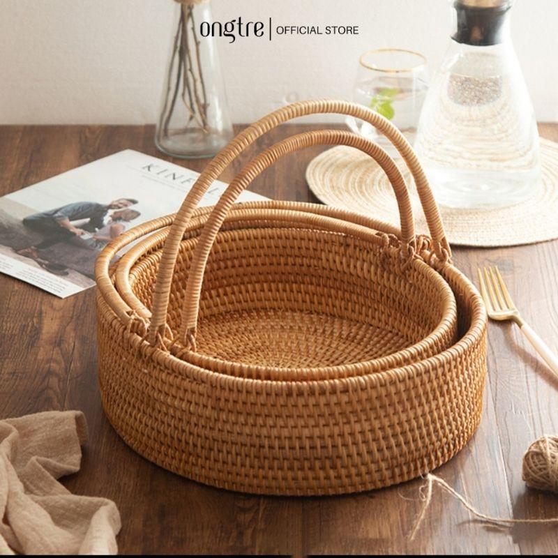 Khay mây ECOHUB tròn đựng đồ có quai xách phù hợp trang trí tiệc, decor phòng, dã ngoại