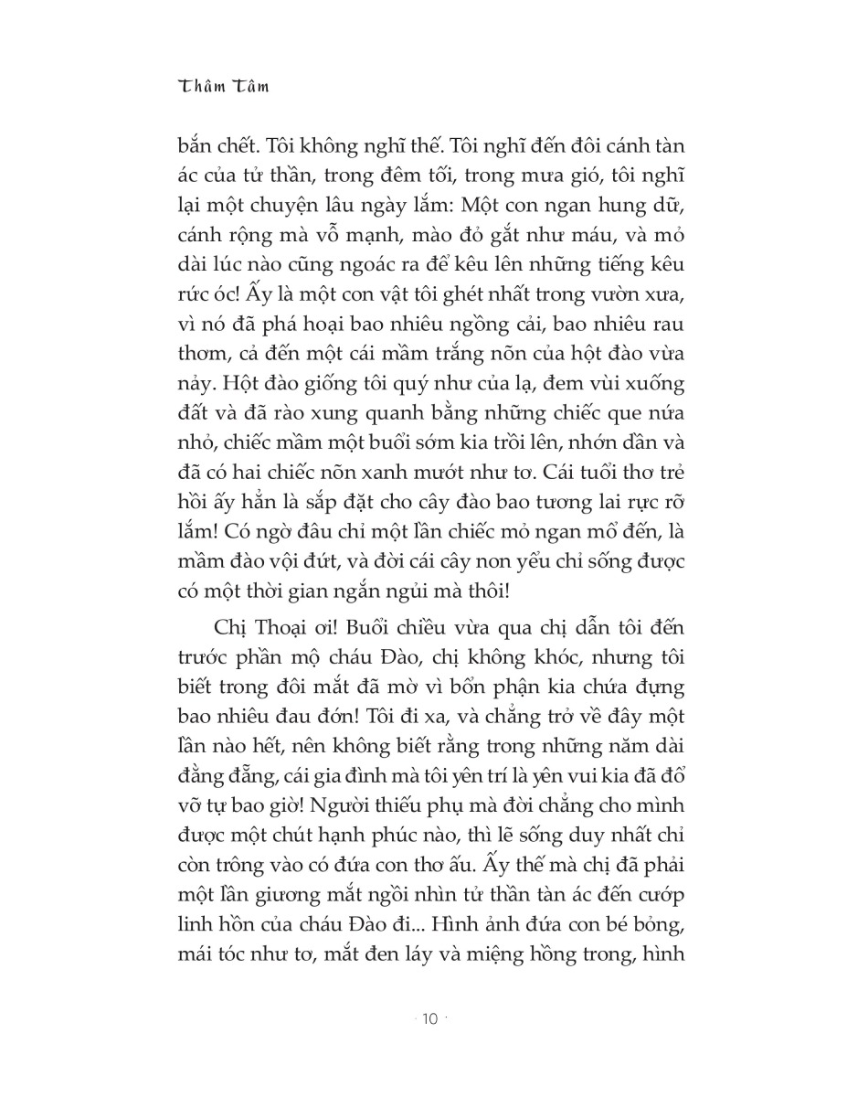 Chúng đã quá cái độ tươi cười rồi. Cánh mảnh, nhụy mòn, cuống lả xuống và đài quắt đi, đóa hoa thật là gầy và ốm. Cúc không còn chủ nhân, cúc chỉ còn những bóng chiều một đi một mất… Ấy là đời một người đàn bà góa.