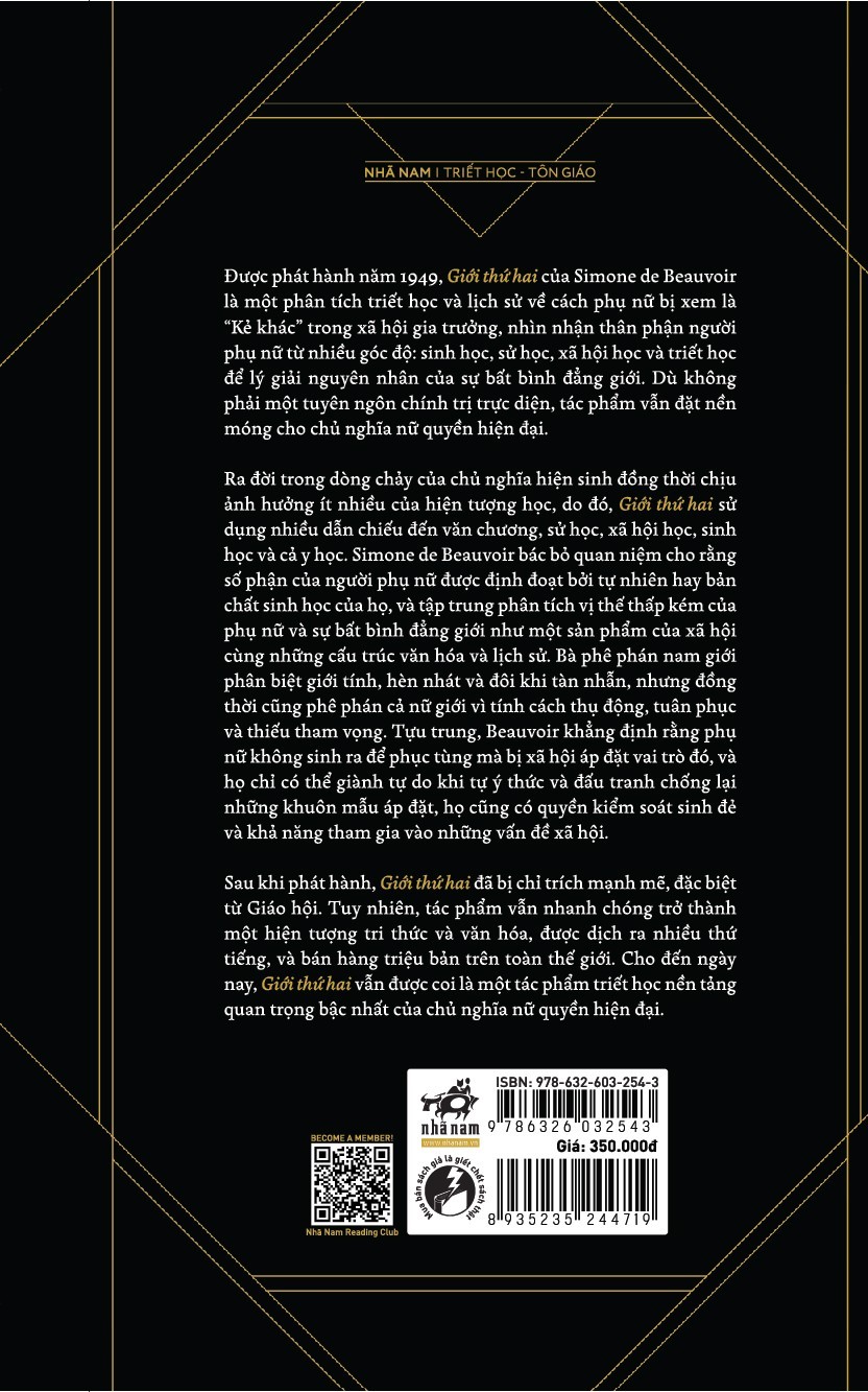 Được phát hành năm 1949, Giới thứ hai của Simone de Beauvoir là một phân tích triết học và lịch sử về cách phụ nữ bị xem là “Kẻ khác” trong xã hội gia trưởng, nhìn nhận thân phận người phụ nữ từ nhiều góc độ: sinh học, sử học, xã hội học và triết học để lý giải nguyên nhân của sự bất bình đẳng giới. Dù không phải một tuyên ngôn chính trị trực diện, tác phẩm vẫn đặt nền móng cho chủ nghĩa nữ quyền hiện đại.