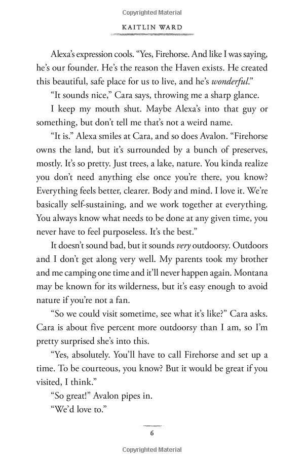 Mailee and Cara take care of each other. Mailee is the star of the high school plays; Cara is the stage manager. Mailee can't keep her life together; Cara has enough organizational skills for the both of them.So when the girls are invited to visit the Haven, a commune in the mountains near their suburban Montana homes, it seems like an adventure. Until Cara starts spending every waking minute and Mailee thinks it's creepy, almost like a cult. When Cara decides she's going to move to the Haven permanently, Mailee knows it's a bad idea. But how far will she go to save her best from herself?