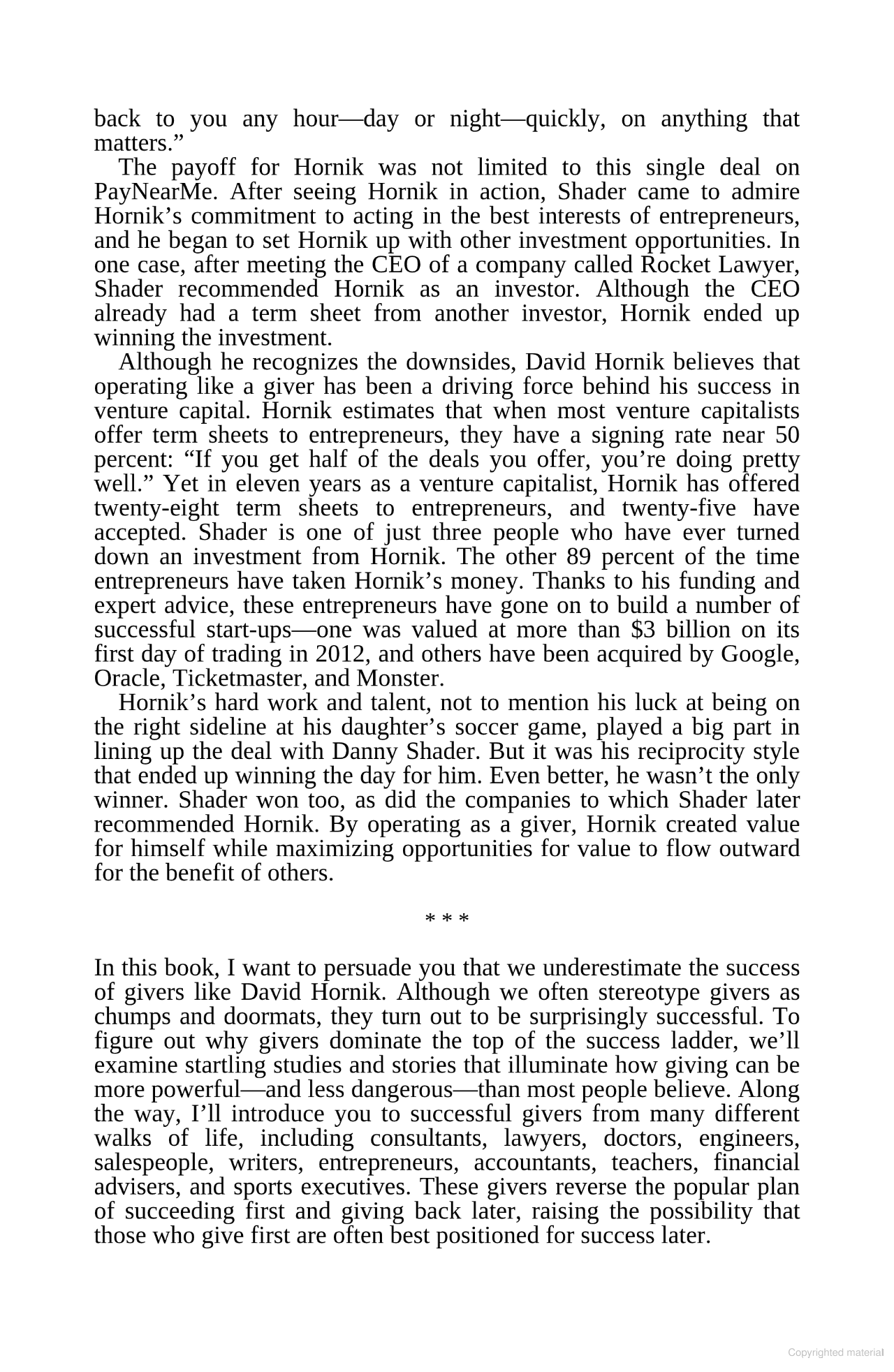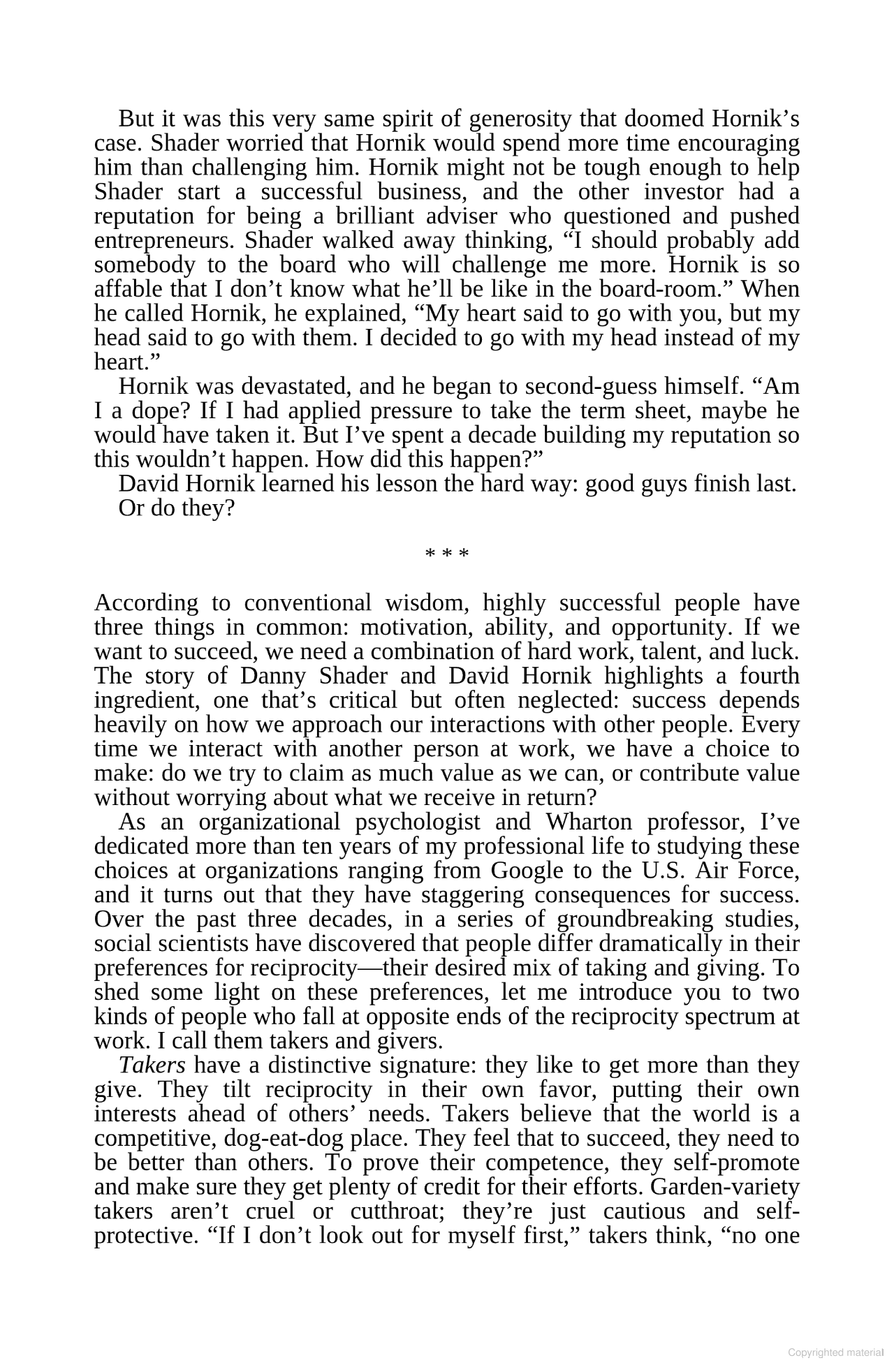GIVE AND TAKE presents the fascinating secrets to givers' success. The results are unequivocal: givers gain big. Jack Welch, Richard Branson, Jon Huntsman Sr. - all of them are givers. In a world in which so many takers such as Bernard Madoff and Raj Rajaratnam have ruined lives and reputations, this book will reassure readers that the real power lies in becoming a giver. Since the vast majority of people aren't born givers, Grant not only presents the case for why givers win, he also offers their hidden strategies for winning.