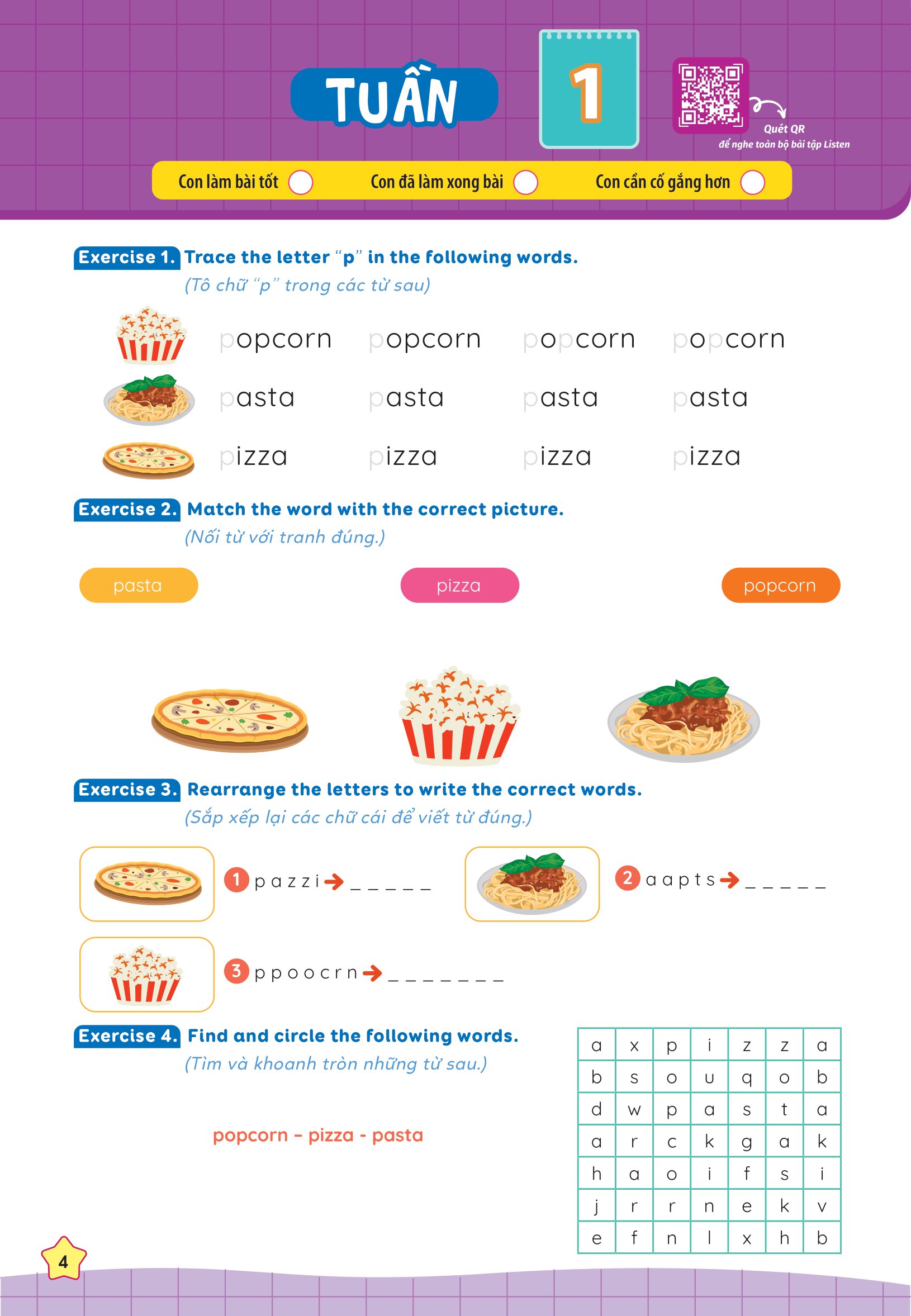 3. File nghe phát âm chuẩn (quét mã QR)   Mỗi bài tập đi kèm với mã QR cho phép truy cập vào file nghe phát âm chuẩn của từ vựng. Điều này giúp các em học sinh luyện nghe và học phát âm chính xác ngay từ đầu, xây dựng nền tảng ngôn ngữ vững chắc.