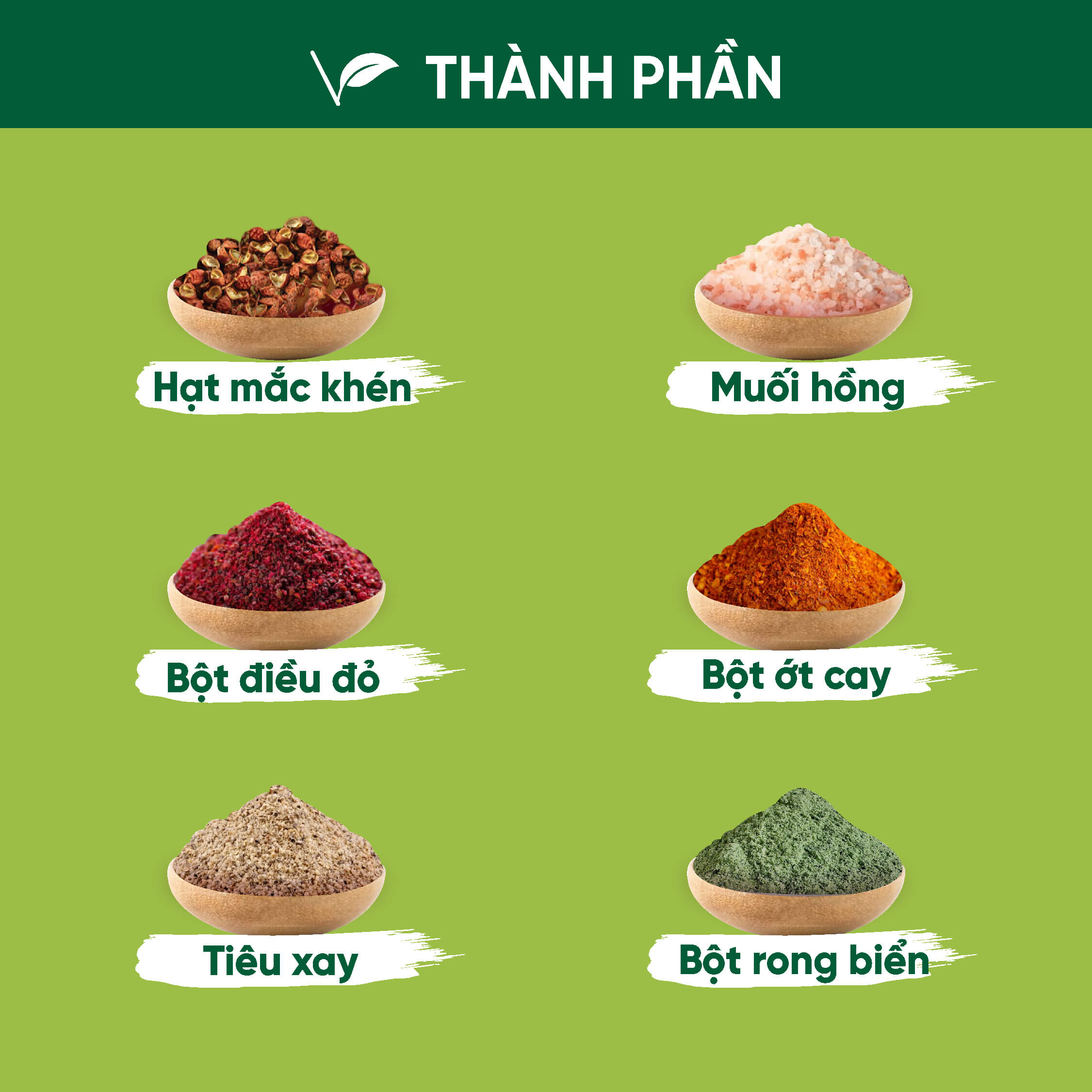 Thành phần chính: Muối sấy, đường cát, muối hồng, hạt mắc khén, bột ớt cay, bột chanh, lá chanh,...