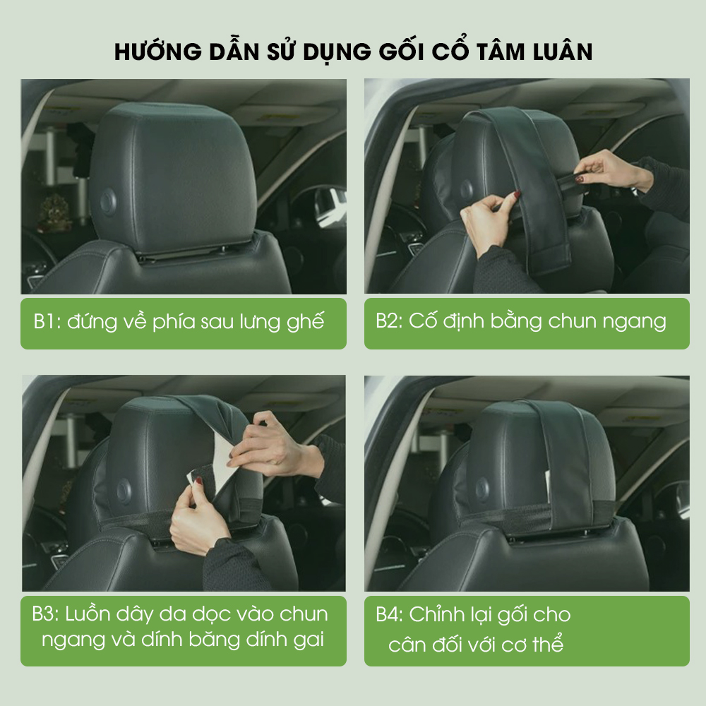 - Gối tựa cổ cố định với ghế xe bằng chun ngang và dây da dọc gắn băng dính gai. Chắc chắn đảm bảo không xộc xệch khi di chuyển như loại chỉ cố định 1 dây ngang.