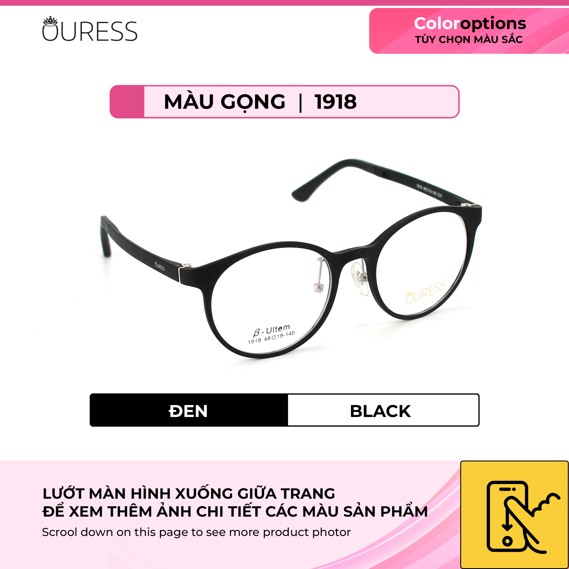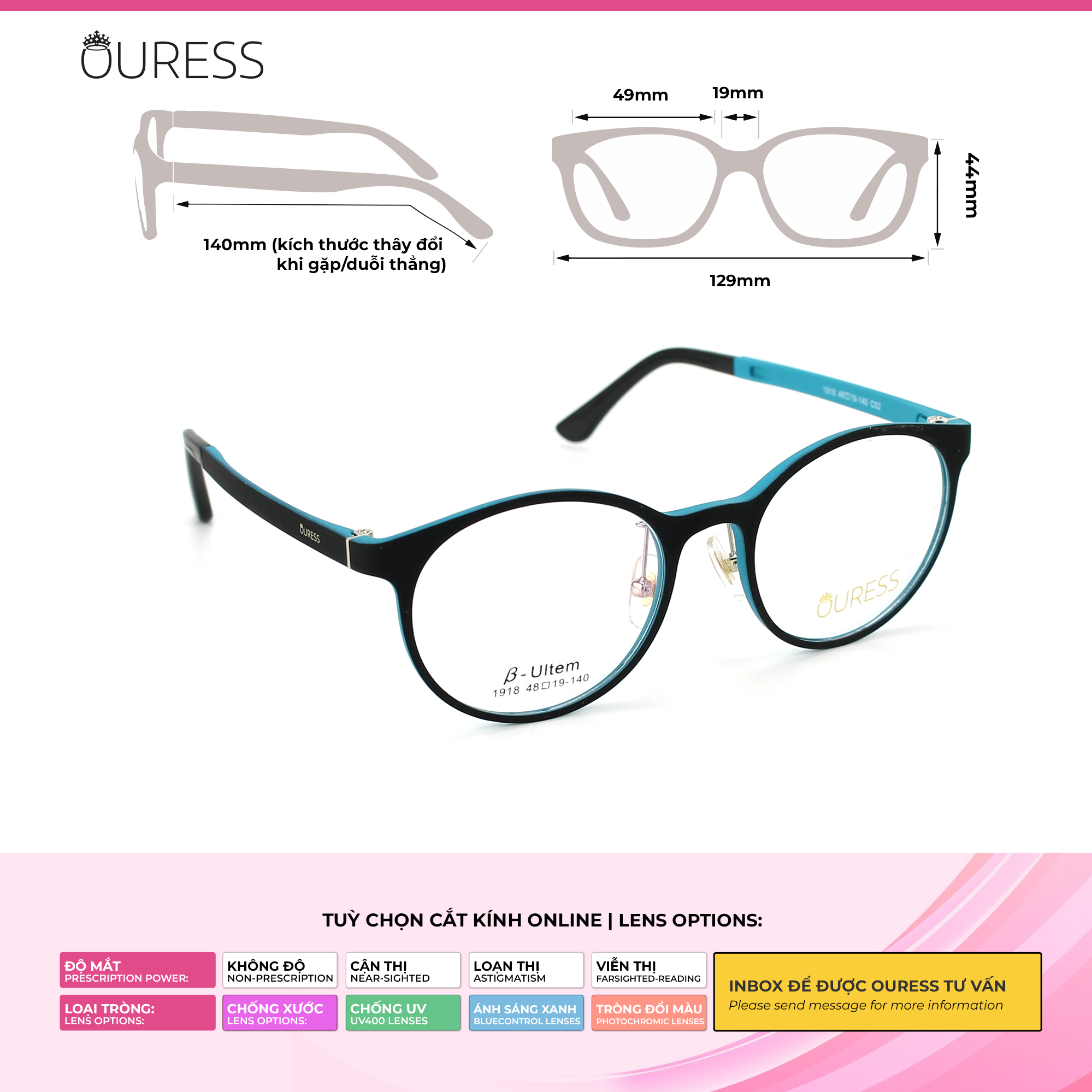 Nhựa Ultem là một trong những chất liệu nổi tiếng trong ngành kính. Đây là nhựa vô định hình với độ bền và độ cứng cơ học cao. Chúng có đầy đủ các đặc tính nhiệt học, kỹ thuật và hoá học ưu việt nên vượt trội trong tất cả các loại. • Gọng kính Ultem có đặc tính siêu nhẹ,độ dẻo dai cao và đàn hồi cực tốt. Nó có thể chịu áp lực nhiệt độ cao, và chịu ma sát tốt • Gọng Ultem không dễ bị biến dạng nên dùng được bền lâu, đặc biệt không gây kích ứng da nên rất an toàn khi sử dụng. • Mẫu mã và kiểu dáng đa dạng, lạ mắt, độc đáo. • Gọng kính được thiết kế nhiều màu sắc tạo nên sự trẻ trung và nhiều sự lựa chọn cho người mang. • Gọng kính thích hợp với nhiều dáng mặt khác nhau, và không kén chọn độ tuổi • Gọng kính lắp được tất cả các loại tròng: cận /viễn / loạn/ lão, với nhiều số độ khác nhau —-------------------------------------- HƯỚNG DẪN CÁCH ĐỌC THÔNG SỐ GỌNG KÍNH Thông thường, nhà sản xuất sẽ in thông số trên tròng kính hoặc càng kính để người dùng hình dung về các kích thước của gọng kính. Ví dụ, trên tròng kính bạn thấy một dãy số: 1918 49-19-140 • 1918: là mã gọng kính • 49: ngang khung tròng kính là 49 mm • 19 : cầu mũi là 19 mm • 140 : chiều dài càng kính 140mm •Cao kính : 44 mm •Chiều ngang tổng thể gọng kính: 129 mm ++ Mã này là size kính dành cho gương mặt nhỏ *** tỷ lệ chênh lệch thông số +/- 2mm. Qúy khách có thể liện hệ shop để được tư vấn chọn gọng kính phù hợp với size gương mặt mình nhé vì đây chỉ là thông số tham khảo —-------------------------------------- Bộ phụ kiện đi kèm theo Kính Ouress gồm: -Khăn lau kính và hộp đựng kính ( bộ phụ kiện này không áp dụng cho những sản phẩm sale trên 40% )