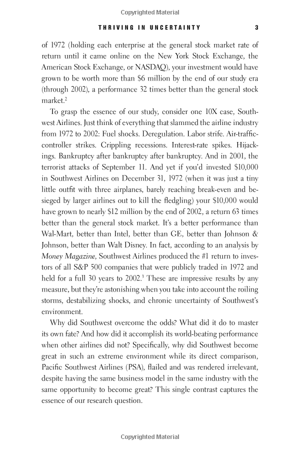 With a team of more than twenty researchers, Collins and Hansen studied companies that rose to greatness—beating their industry indexes by a minimum of ten times over fifteen years—in environments characterized by big forces and rapid shifts that leaders could not predict or control. The research team then contrasted these “10X companies” to a carefully selected set of comparison companies that failed to achieve greatness in similarly extreme environments.
