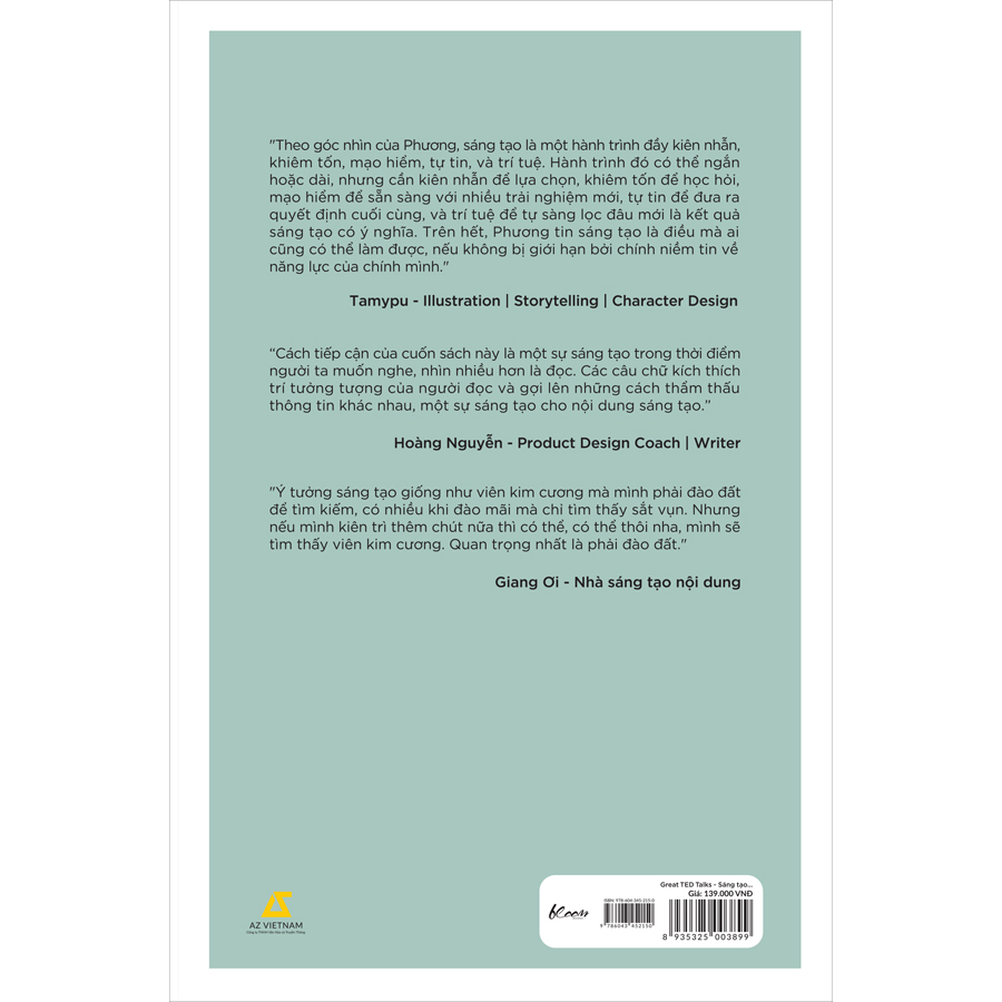 Lời giới thiệu từ những người có sức ảnh hưởng trong nhiều lĩnh vực tại Việt Nam "Theo góc nhìn của Phương, sáng tạo là một hành trình đầy kiên nhẫn, khiêm tốn, mạo hiểm, tự tin, và trí tuệ. Hành trình đó có thể ngắn hoặc dài, nhưng cần kiên nhẫn để lựa chọn, khiêm tốn để học hỏi, mạo hiểm để sẵn sàng với nhiều trải nghiệm mới, tự tin để đưa ra quyết định cuối cùng, và trí tuệ để tự sàng lọc đâu mới là kết quả sáng tạo có ý nghĩa. Trên hết, Phương tin sáng tạo là điều mà ai cũng có thể làm được, nếu không bị giới hạn bởi chính niềm tin về năng lực của chính mình."