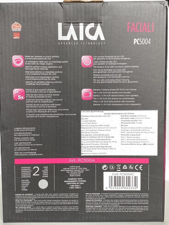 - Sản phẩm này còn được trang bị thêm đèn LED giúp bạn dễ dàng trang điểm mọi nơi khi thiếu ánh sáng mà không làm ảnh hưởng đến người khác, có hình dáng vô cùng nhỏ nhắn, thanh lịch, thiết kế thông minh có thể nghiêng nhiều góc giúp bạn dễ dàng nhìn ngắm nhiều phía của khuôn mặt hơn. Gương trang điểm Laica PC5004 chính hãng ITALY Thông Tin Sản Phẩm Gương Trang Điểm Laica PC5004