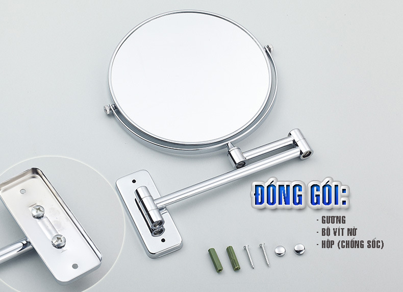 - Gương có bộ khung giá rất linh hoạt với khớp nối có thể kéo ra hay gấp sát vào tường để tiết kiệm diện tích khi không sử dụng. Kích thước: