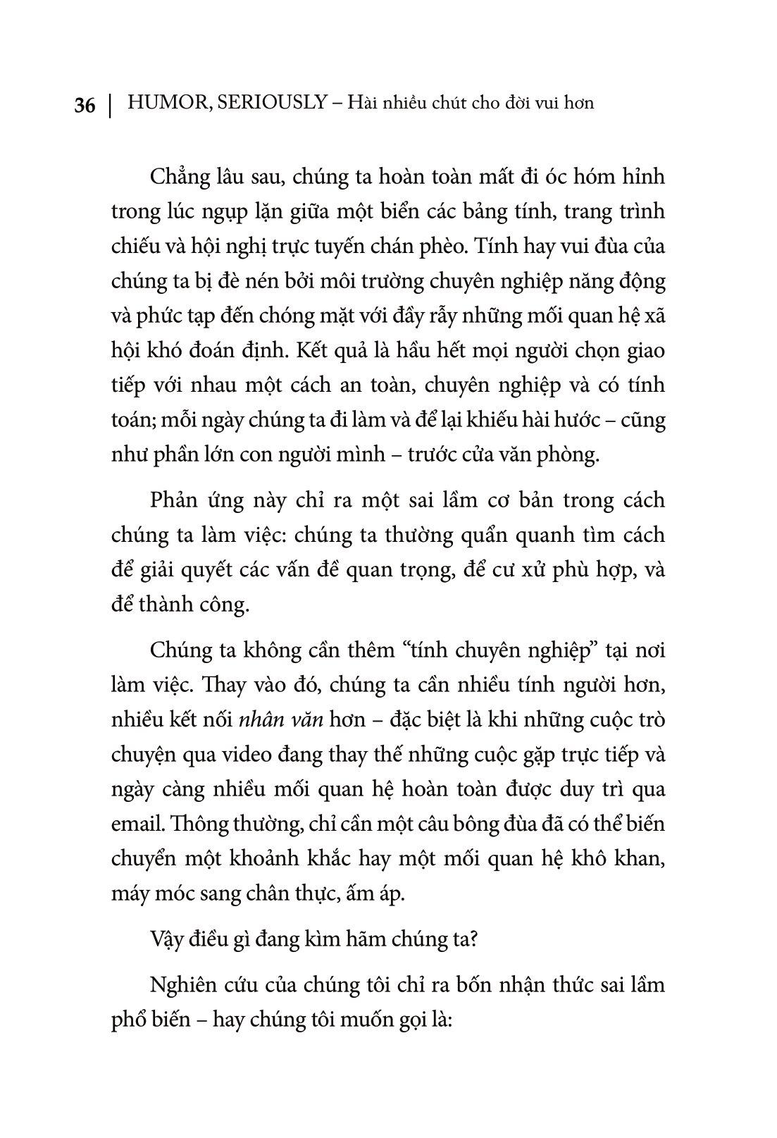 Hơn nữa, cuốn sách HUMOR, SERIOUSLY: Why Humor Is a Secret Weapon in Business and Life này cũng đính chính, bóc tách lợi ích của óc hài hước đối với sự nghiệp, công ty và cuộc sống chúng ta bằng cách sử dụng cách thức quyến rũ nhất trong giới học thuật: khoa học hành vi (cùng với rất nhiều sự giúp đỡ từ các diễn viên hài và lãnh đạo của doanh nghiệp).