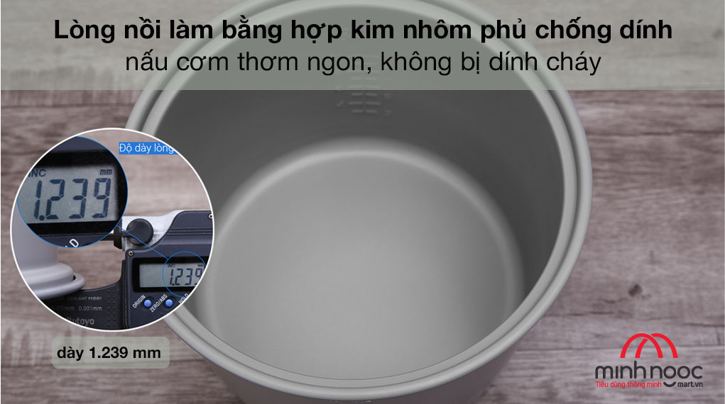 Lòng nồi dày 1.239 mm làm bằng hợp kim nhôm phủ chống dính, giúp cơm không bị dính cháy, chín đều thơm ngon an toàn sức khỏe, hạn chế bám bẩn và dễ vệ sinh.